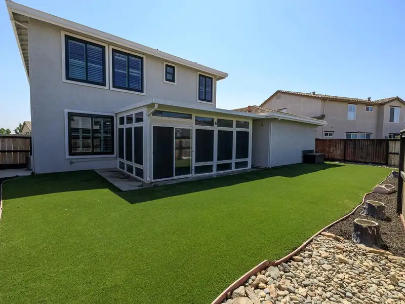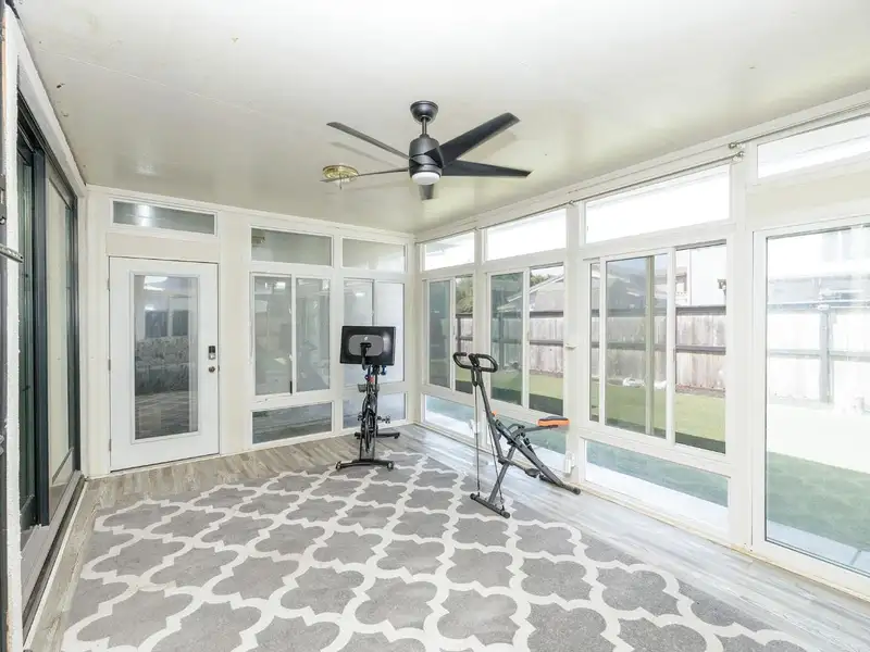 - Bright sunroom overlooking low-maintenance yard