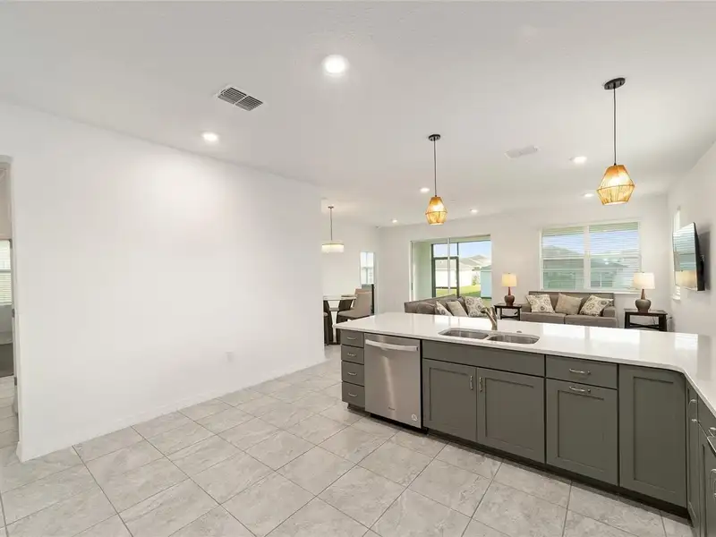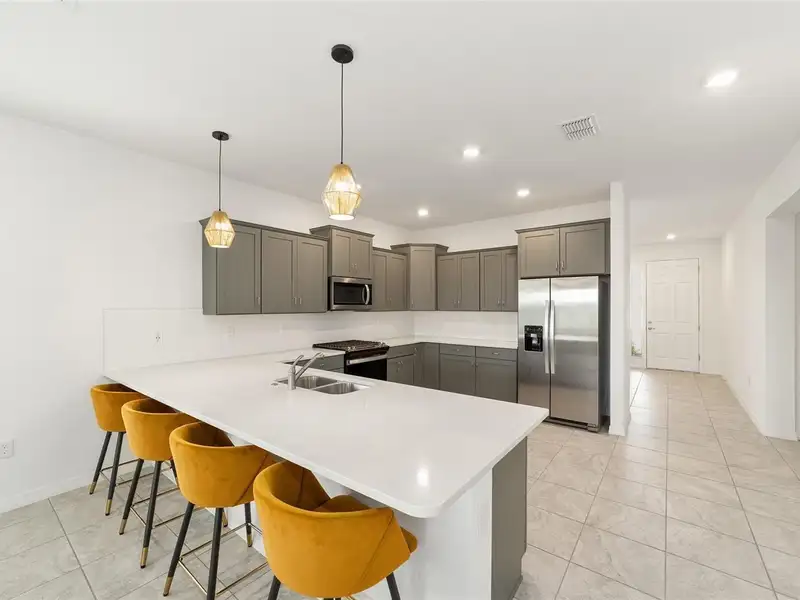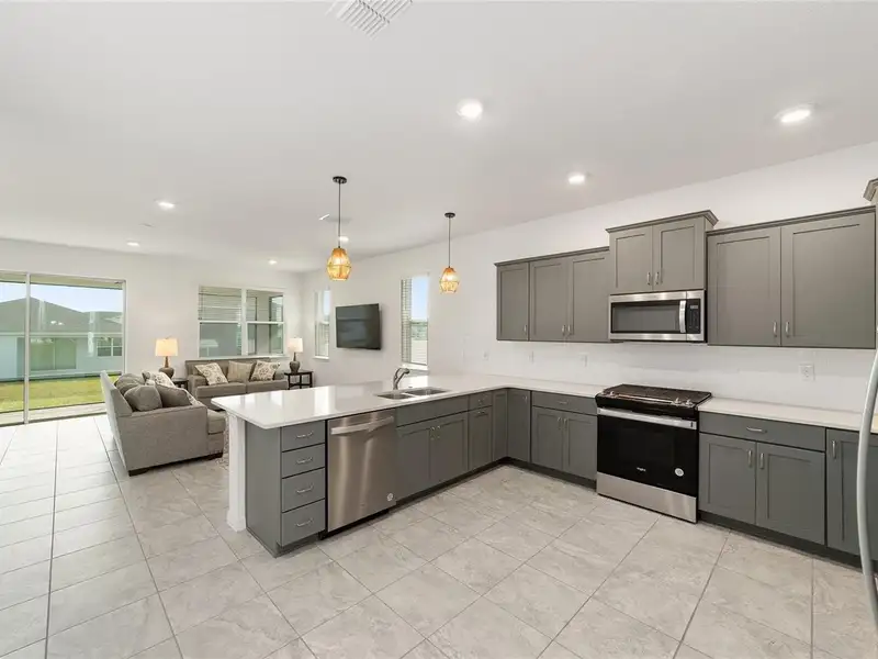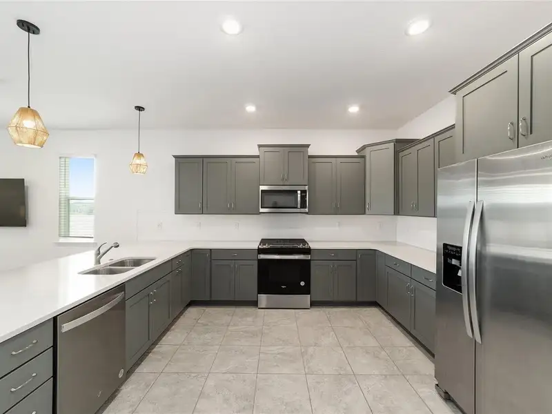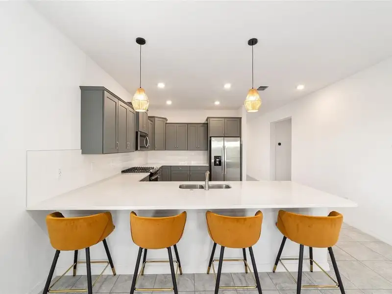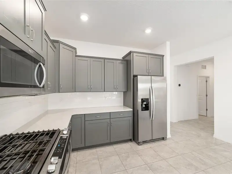 - Kitchen with quartz counters and gas stove