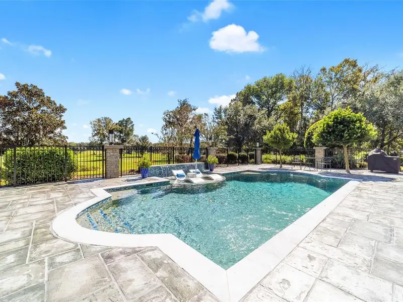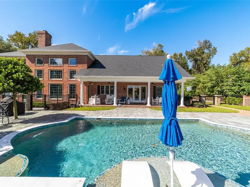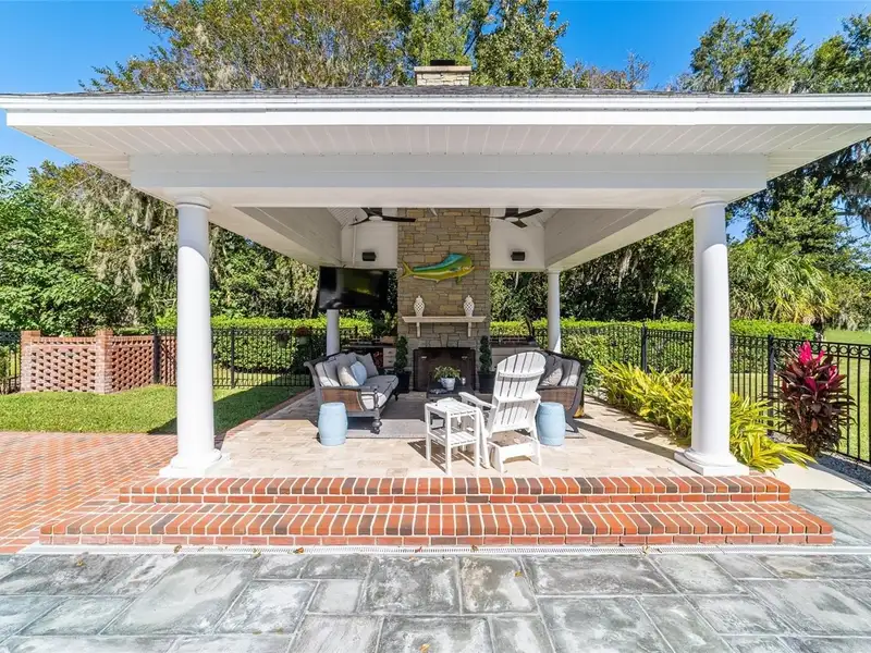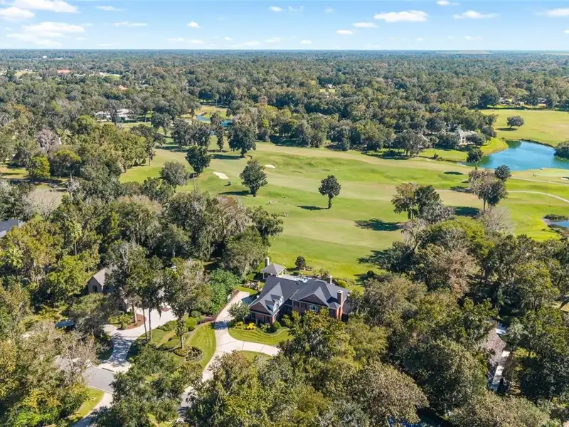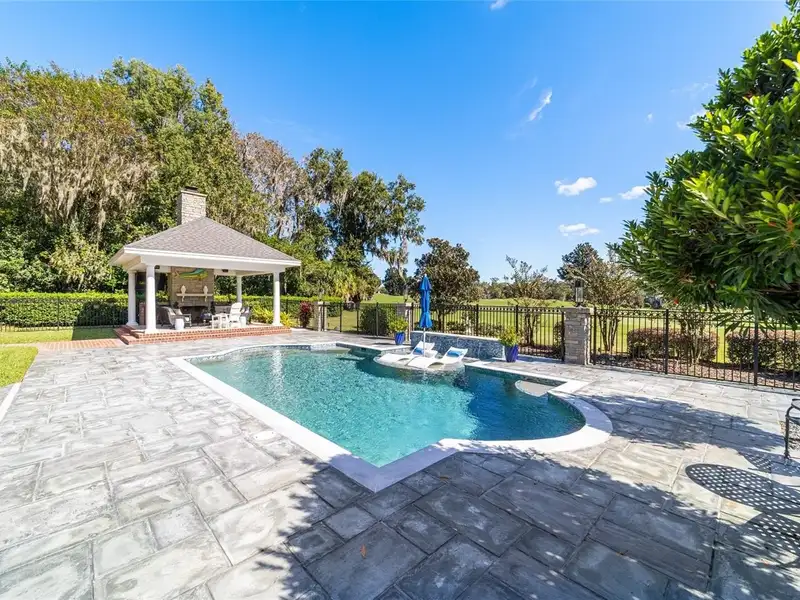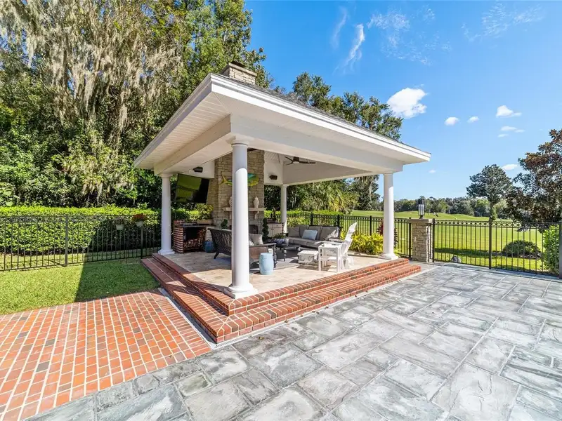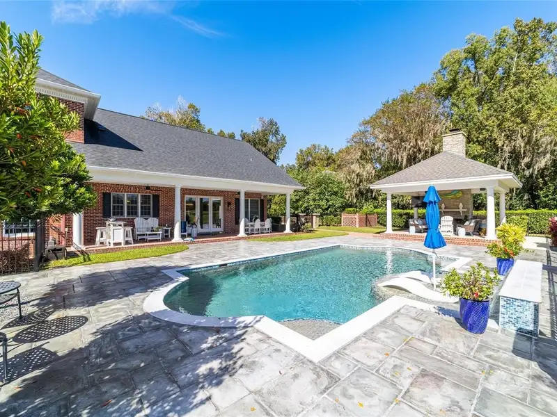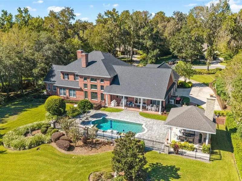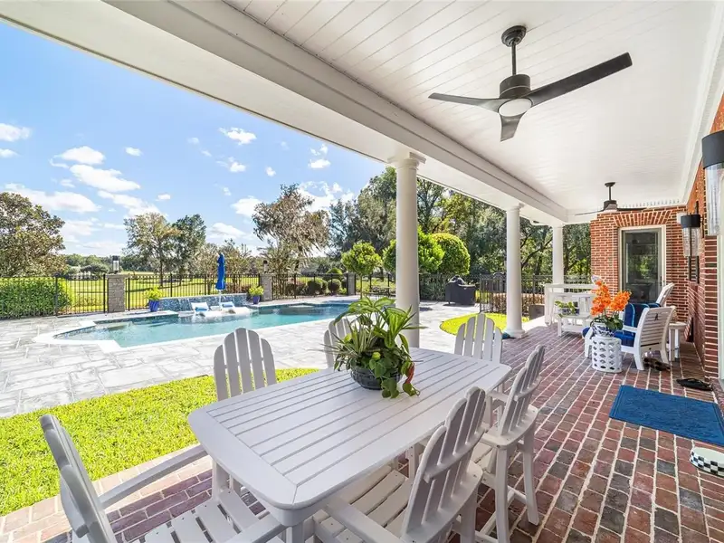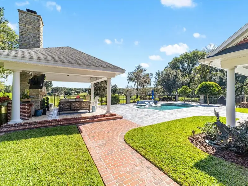 This stunning two-story red brick estate offers timeless charm, modern updates and breathtaking golf course views overlooking the 15th hole and beyond. Featuring 4 bedrooms, 3 full baths and 2 half baths, every space has been thoughtfully designed for everyday living. Step through the foyer and you’re greeted by a custom staircase leading to the second floor of the home. The main floor features a formal living room with a fireplace and mantle that have been beautifully updated, a spacious formal dining room and a family room that extends 2 stories, where walls of windows fill the space with natural light. A second wood-burning fireplace framed by custom built-ins anchors this inviting gathering space. The gourmet kitchen, fully remodeled in 2018, truly is the heart of the home with white wood cabinetry, gorgeous granite countertops, double ovens and a thoughtful layout that opens to a breakfast area and cozy sitting room, complete with a built in cabinet and beverage bar. The refinished hardwood floors flow beautifully throughout this space, extending to the staircase that leads to a large bonus/media room. The primary suite, completely redesigned in 2023, has exquisite finishes and a spa-inspired bath. Up the main staircase, you’ll find a loft area with a built-in desk and three additional bedrooms, with two sharing a Jack-and-Jill bath and one with a private ensuite, both featuring updated showers and modern touches. Outdoors, enjoy your own private oasis. The saltwater pool, fully redone in 2024 with new marcite, stone and updated pool equipment is surrounded by beautiful bluestone pavers and is fully fenced with a gate for privacy. Entertain year-round under the 25' x 25' pavilion, complete with a wood-burning fireplace and TV hookup, making it the ultimate space for weekend gatherings or quiet evenings by the fire. In addition, the grounds are beautifully landscaped and enhanced by extensive landscape lighting. Additional highlights include an air-conditioned and tiled 3-car garage, perfect for a workshop or home gym. The laundry room update (scheduled for completion December 2025) will feature custom cabinetry matching the kitchen for a cohesive, elevated look throughout the home. This home also has a tankless hot water heater, whole house generator, brand new sub zero refrigerator and all electric drapes. Don't miss this one in the beautiful Country Club of Ocala.