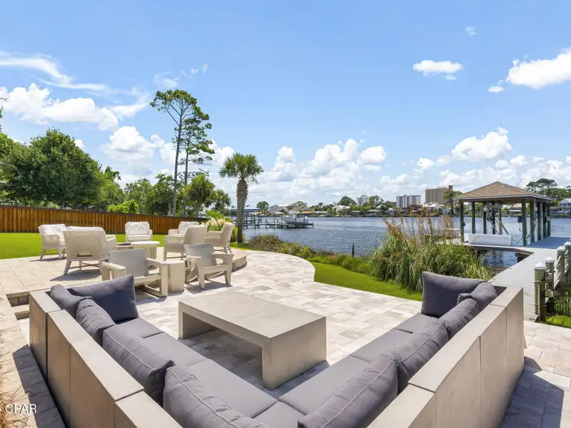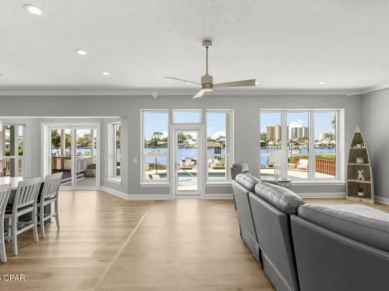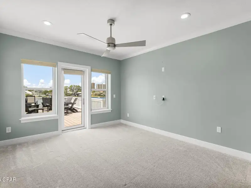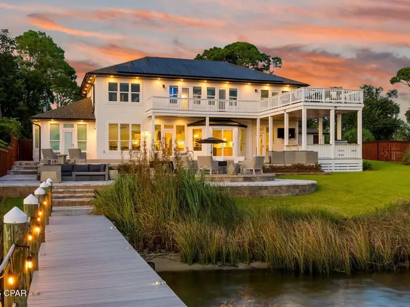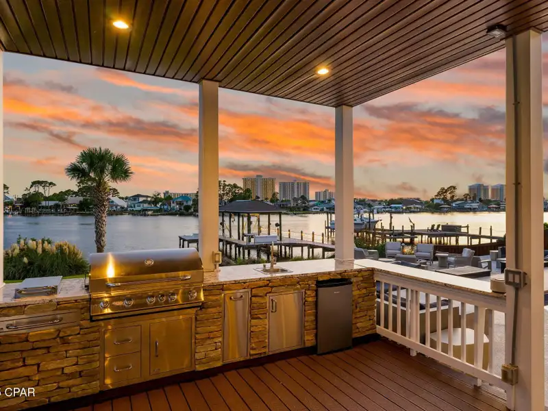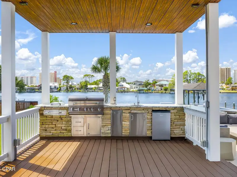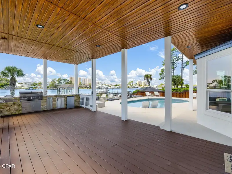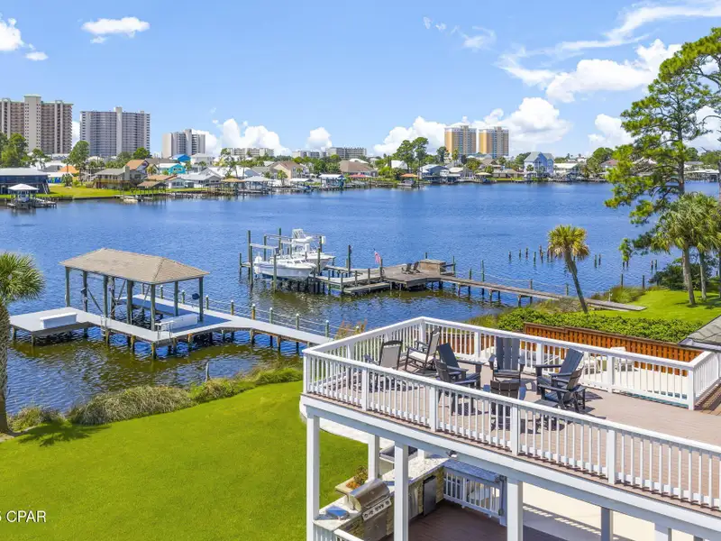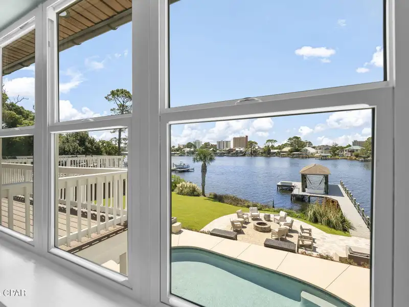 - Covered deck and rear balcony with water views