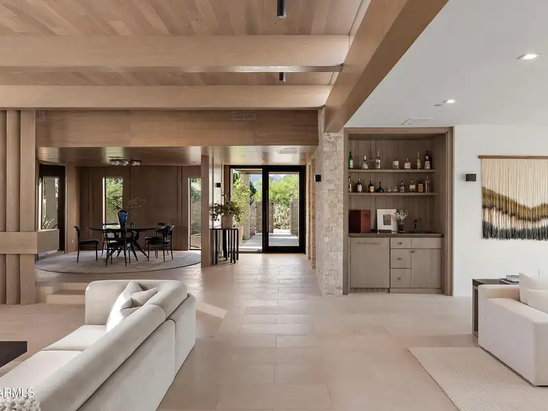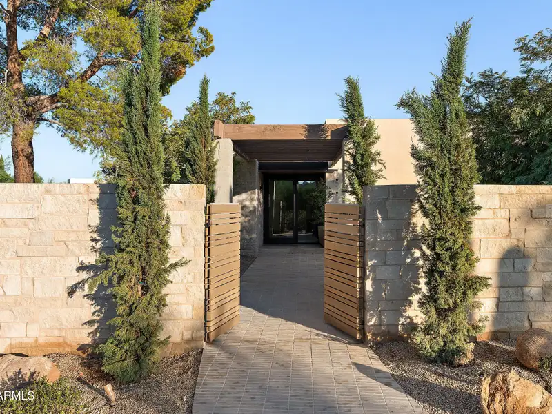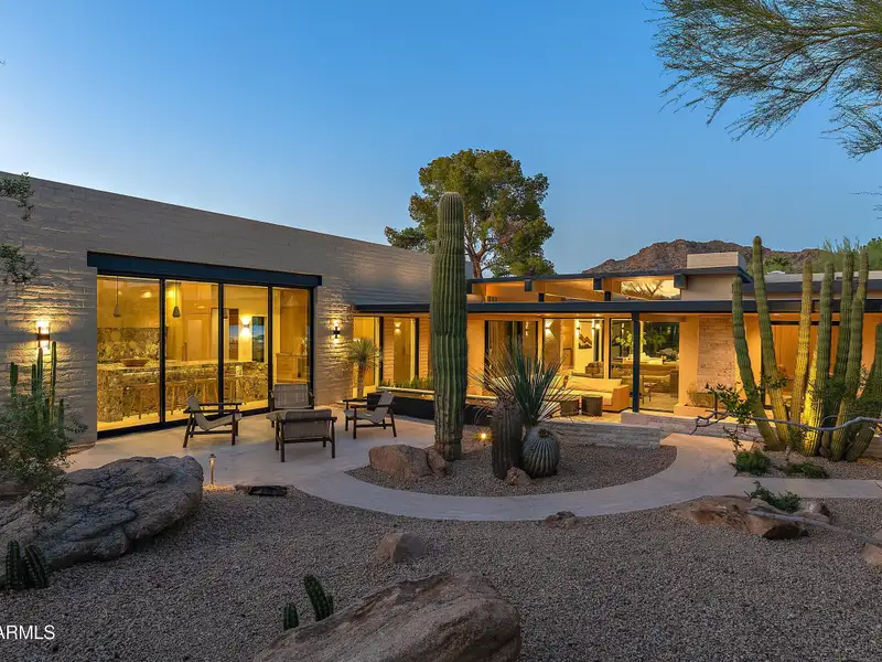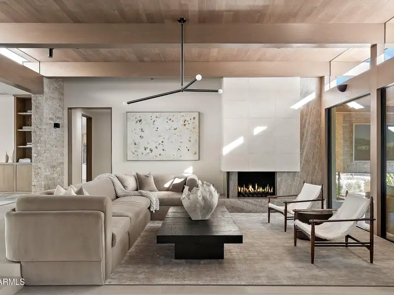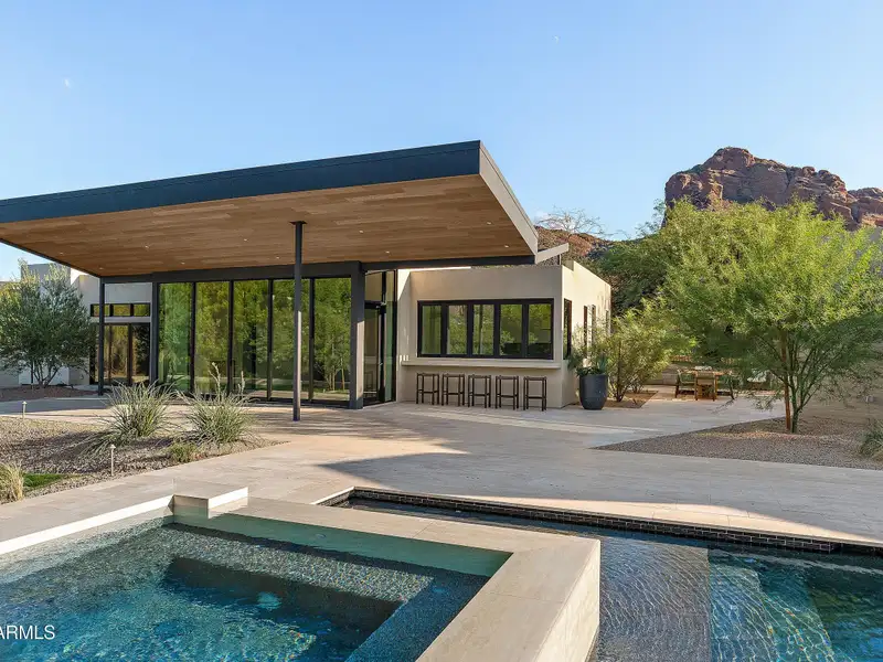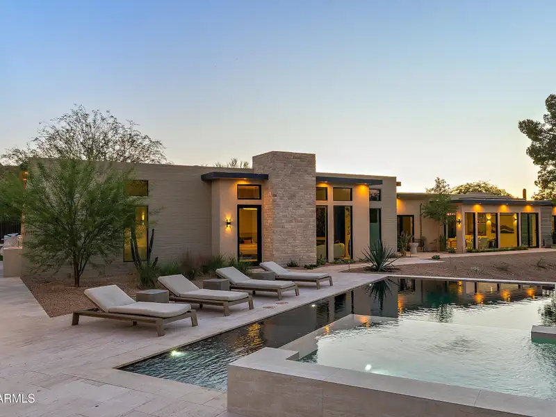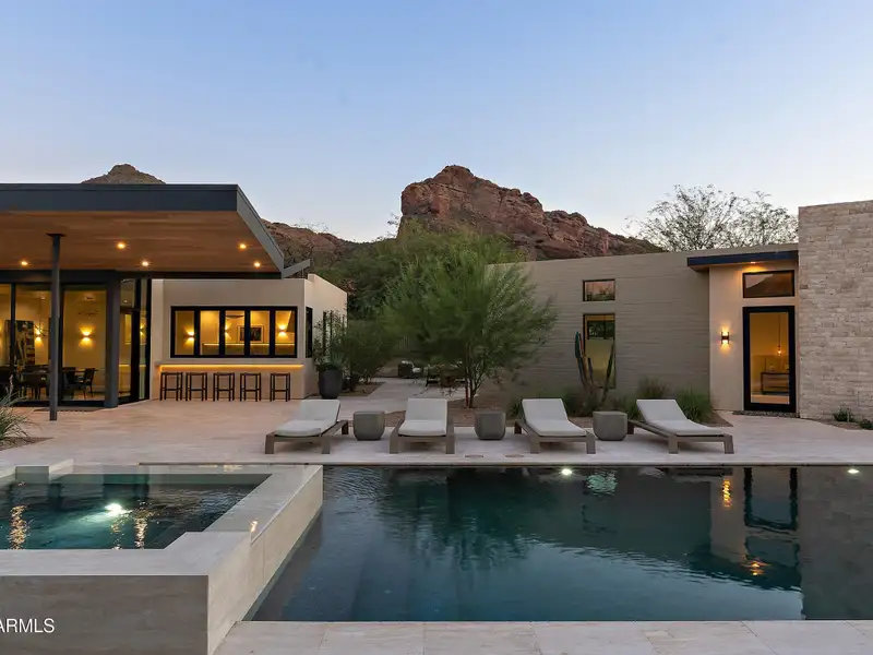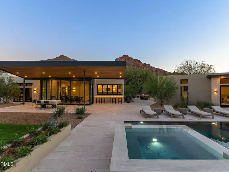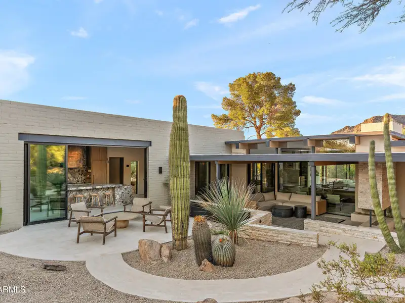 Just completed is a unique, sophisticated new-build by world renowned interior designer Erinn V, in collaboration with Erik Peterson/PHX Architecture. The estate represents a rare fusion of Arizona mid-century architecture, design heritage, & contemporary luxury in Paradise Valley's most desired location, with majestic views of Camelback, Mummy & Phoenix Mountain Preserve. The 1-acre estate includes 6985 sq ft of living space across the main & guest house with walls of glass capturing majestic mountain views & skylights flooding the interiors with natural light. Exceptional workmanship & top-quality materials include honed, oversized limestone flooring, bleached white oak ceilings, custom walnut millwork, Roman clay finishes, custom stonework & natural imported stone countertops. Enjoy the outdoors with lush landscaping, water fountains, and abundant seating areas that create a resort-like setting, while the 40' x 18' zero-edge pool and spa provide a centerpiece for leisure and entertaining.
