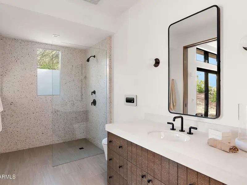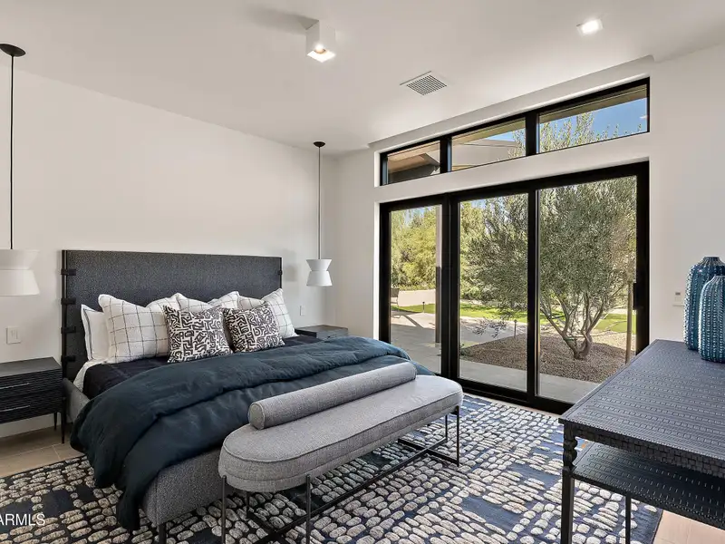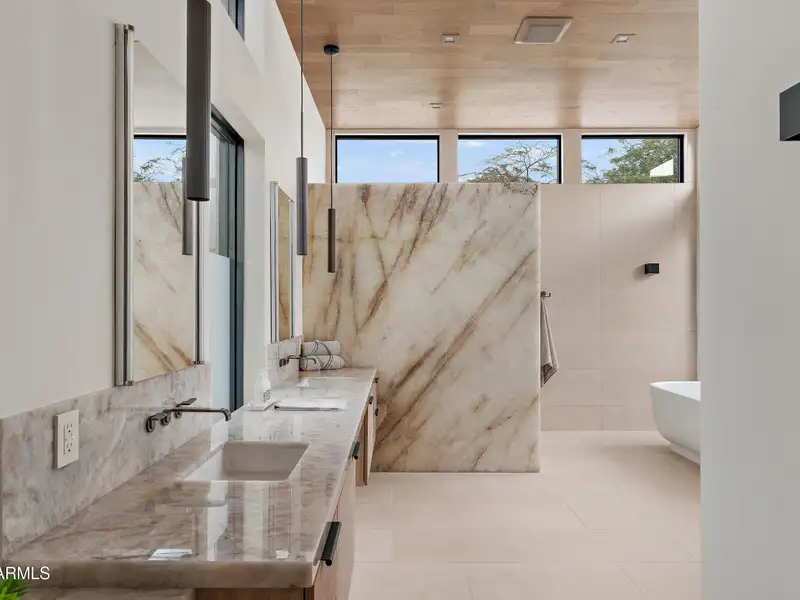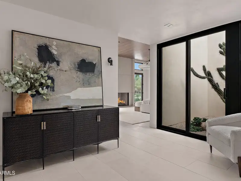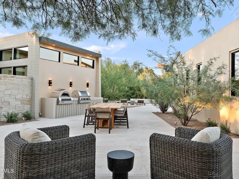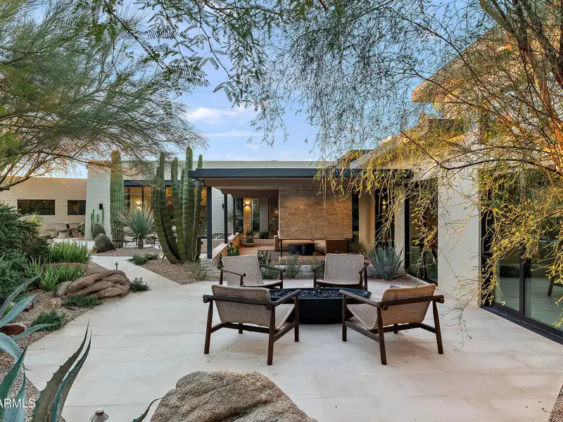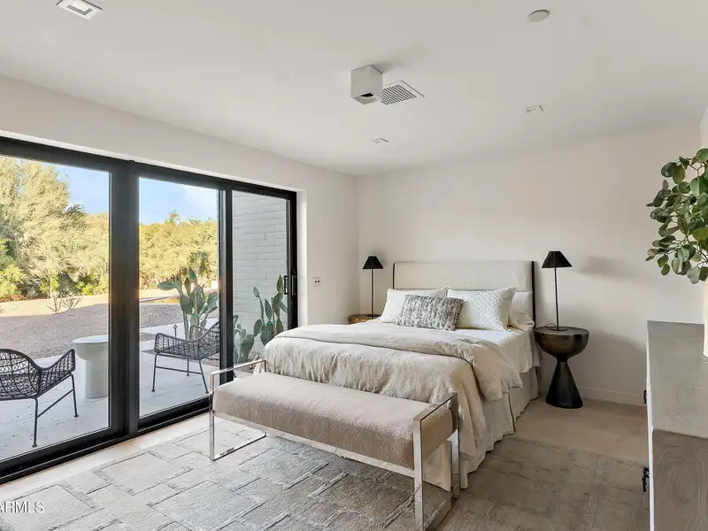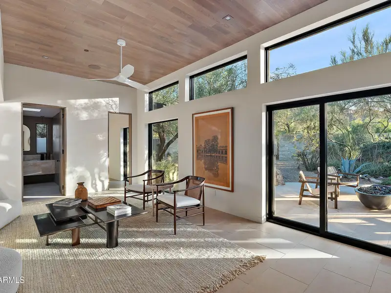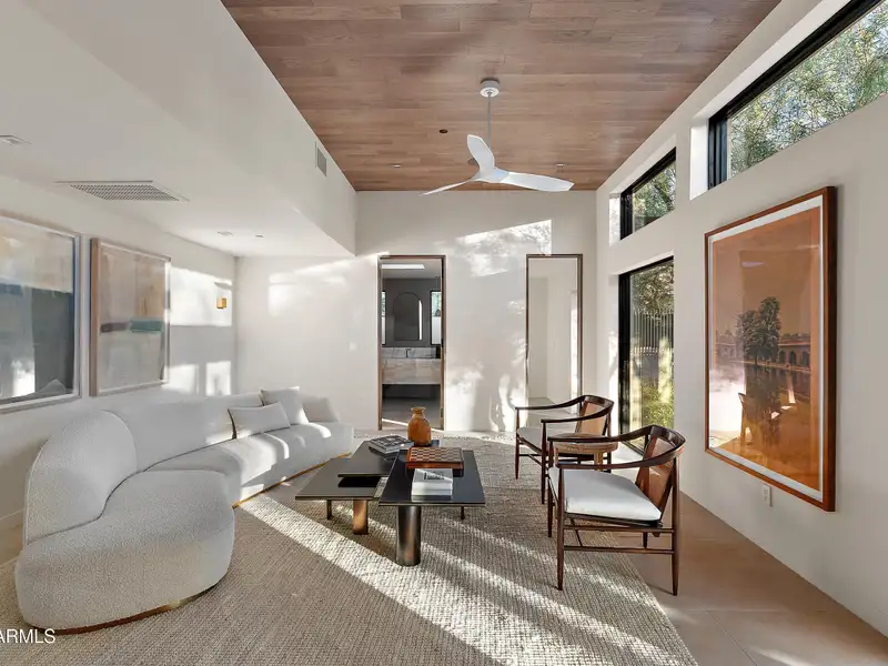 Just completed is a unique, sophisticated new-build by world renowned interior designer Erinn V, in collaboration with Erik Peterson/PHX Architecture. The estate represents a rare fusion of Arizona mid-century architecture, design heritage, & contemporary luxury in Paradise Valley's most desired location, with majestic views of Camelback, Mummy & Phoenix Mountain Preserve. The 1-acre estate includes 6985 sq ft of living space across the main & guest house with walls of glass capturing majestic mountain views & skylights flooding the interiors with natural light. Exceptional workmanship & top-quality materials include honed, oversized limestone flooring, bleached white oak ceilings, custom walnut millwork, Roman clay finishes, custom stonework & natural imported stone countertops. Enjoy the outdoors with lush landscaping, water fountains, and abundant seating areas that create a resort-like setting, while the 40' x 18' zero-edge pool and spa provide a centerpiece for leisure and entertaining.