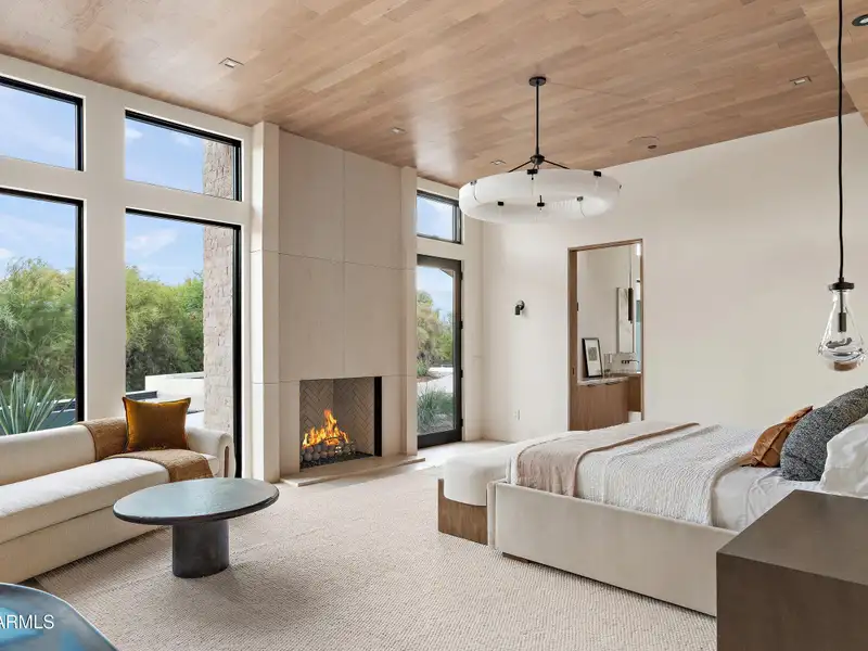 The owner's suite exudes a tranquil ambiance, highlighted by two private Zen gardens and a striking limestone fireplace. Blending elegance with functionality, it offers dual walk-in closets with custom Walnut floor to ceiling cabinetry and stone countertops, along with the convenience of a full-size washer and dryer.