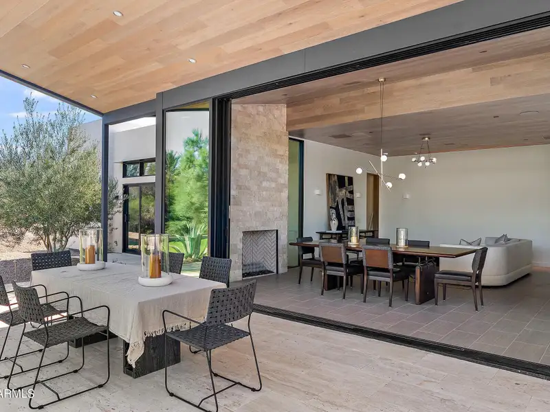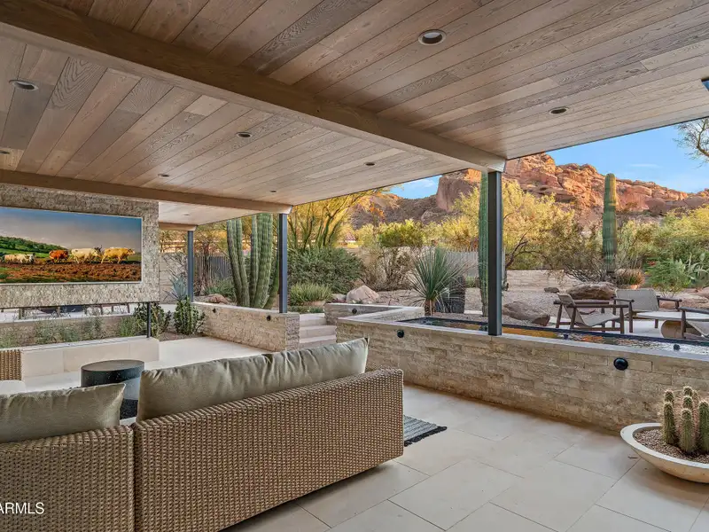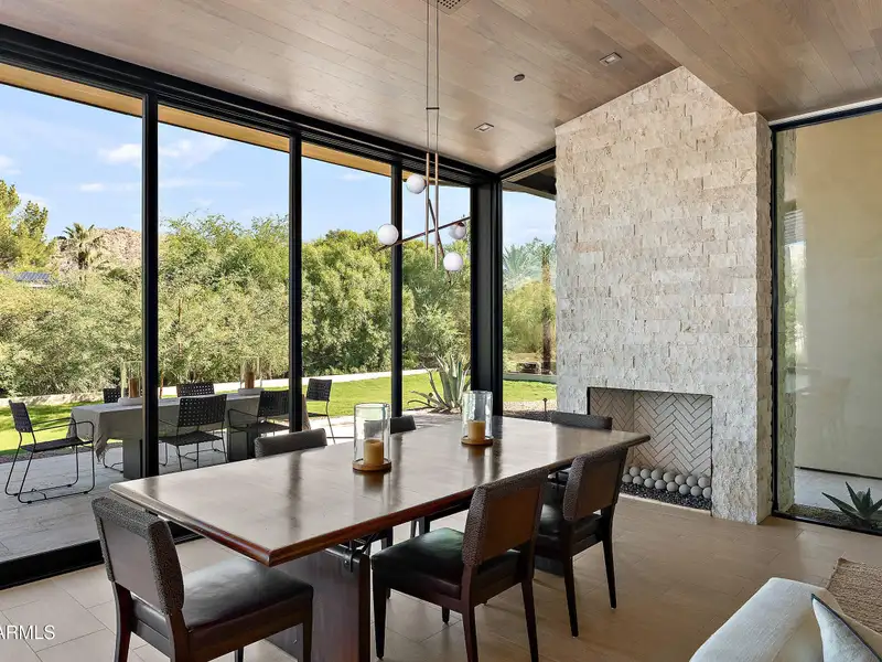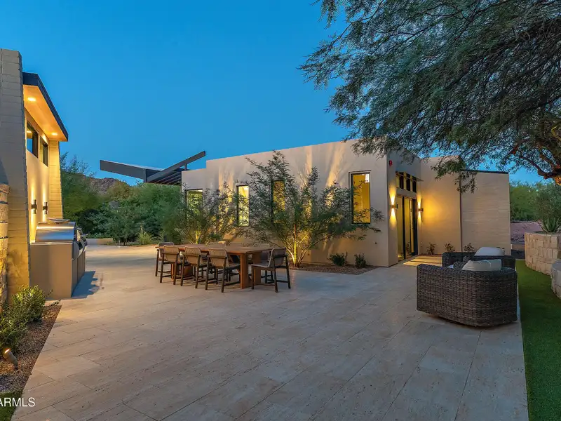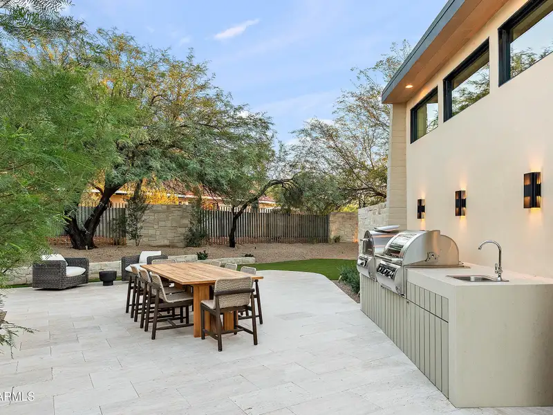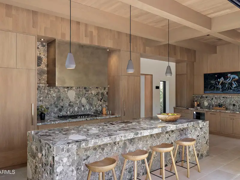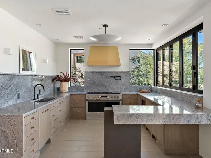 The main house features an impressive Chef's kitchen with walls of glass showcasing up-close views of iconic Camelback Mountain. Designed for both beauty and functionality, the kitchen is equipped with Monogram appliances, custom hand-finished walnut cabinets with white bronze pulls, butler's pantry and stone island clad in Ceppo Breccia slabs from Italy. Oversized sliding doors open the kitchen to a patio with fire features, a water feature and outdoor TV surrounded by beautiful lush desert landscaping.