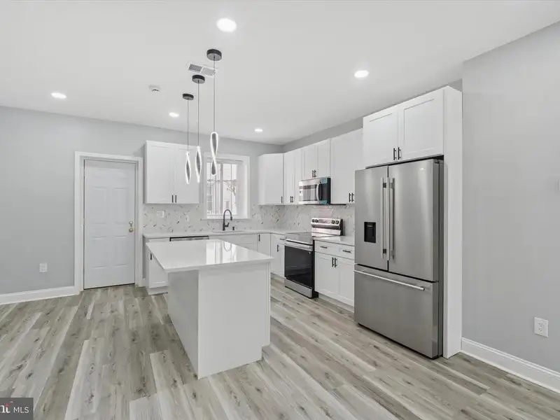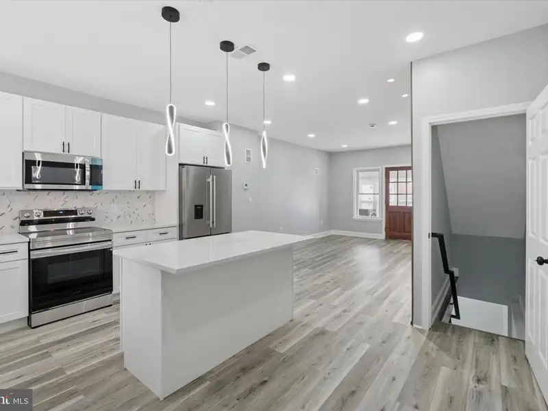 - Modern white kitchen with large island
