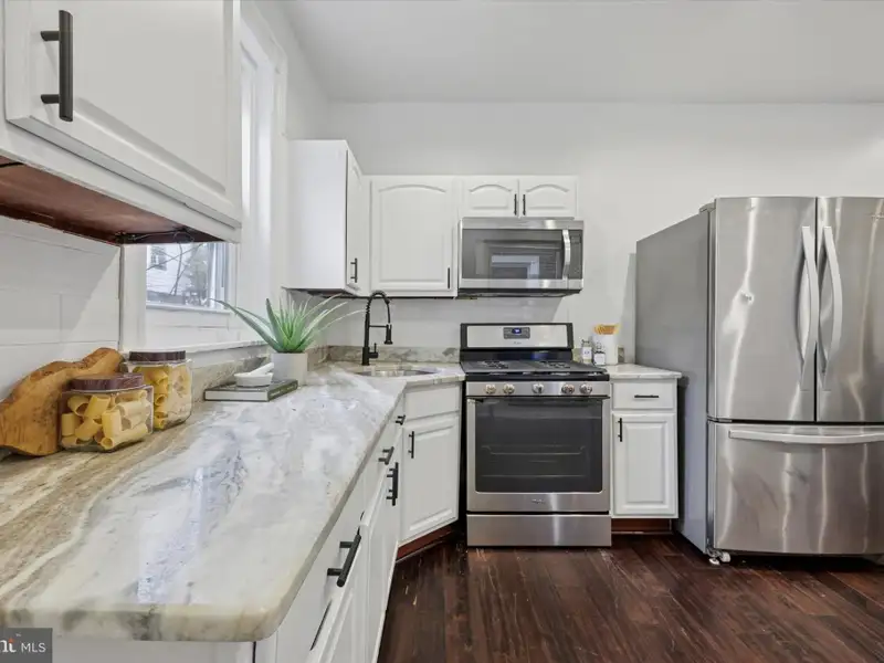 - Kitchen with granite counters and stainless appliances