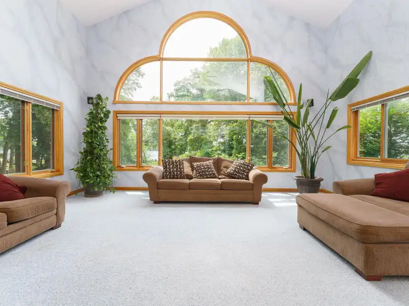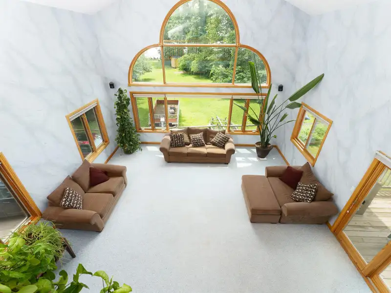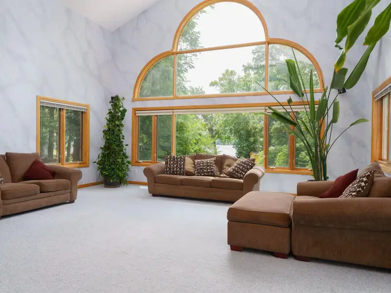 - Grand two-story family room with windows