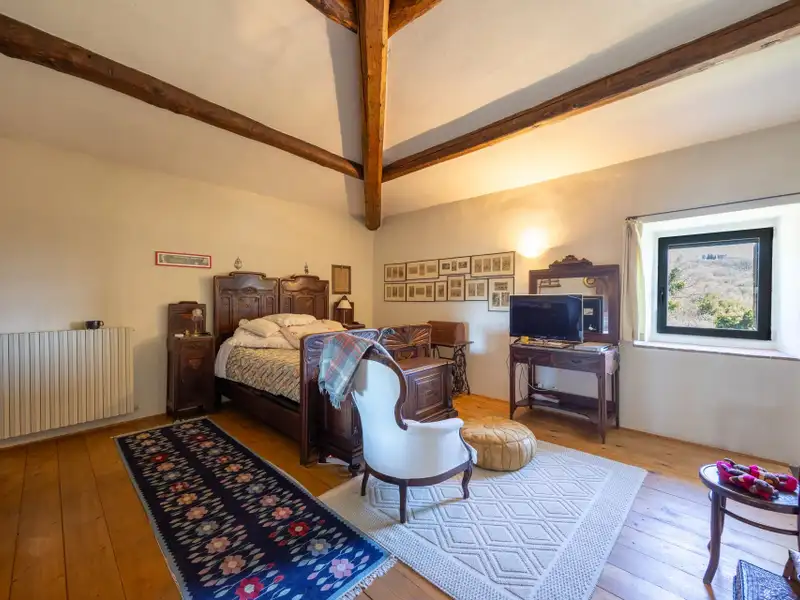 It is arranged on two levels. On the ground floor we find a large living room with an important working fireplace, ceiling with exposed beams and “handmade” terracotta floors. Communicating with the living room is the beautiful eat-in kitchen and dining room.