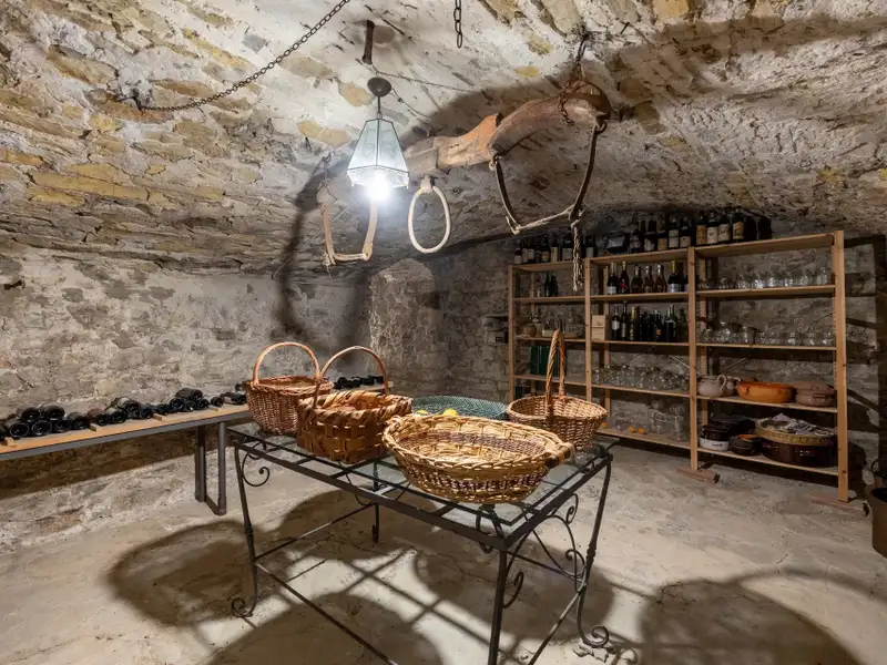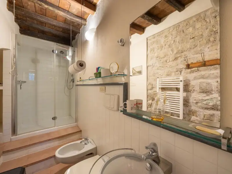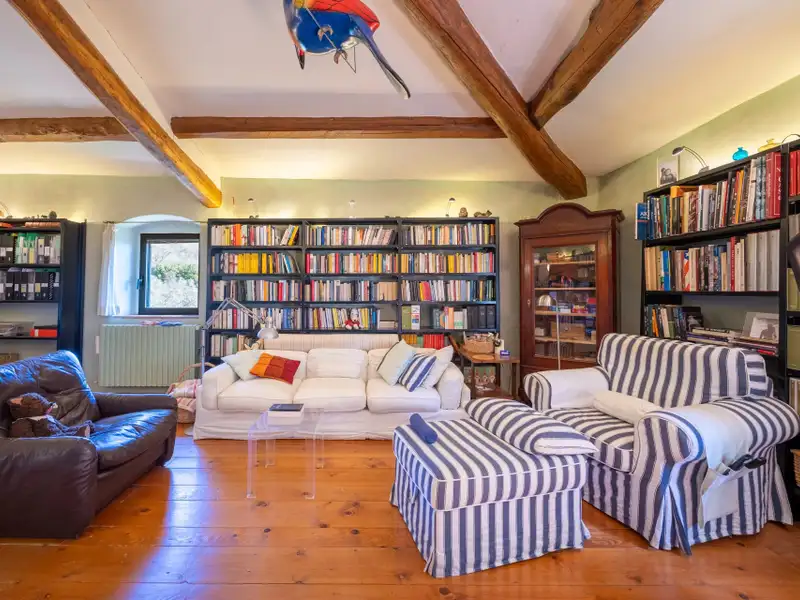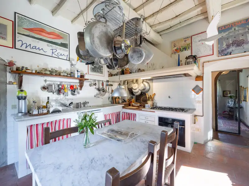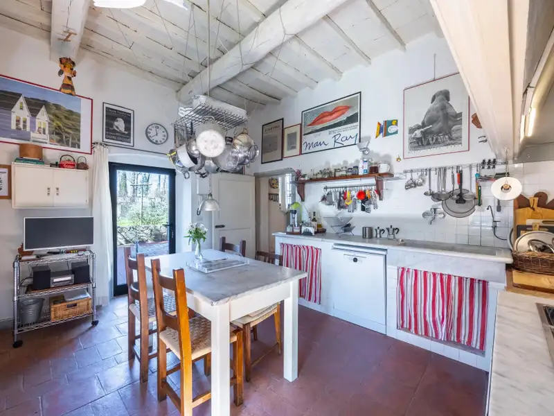 The kitchen is characterized by the beautiful Carrara marble details with which the solid wood countertop was made unique with the sink, cooktop and tabletop. The brick ribbed ceiling characterizes the dining room. Both rooms have direct access to the large outdoor slab with a terracotta floor that extends the living area during summer periods. Adjacent to the dining room is a large room used as a pantry. Also on the same floor a second living room that can be used as a study/bedroom. Two bathrooms. A stone staircase leads down to the charming cellar with brick vaults.