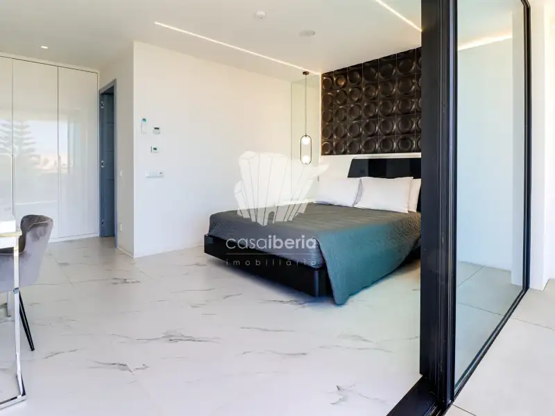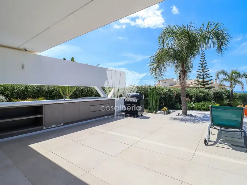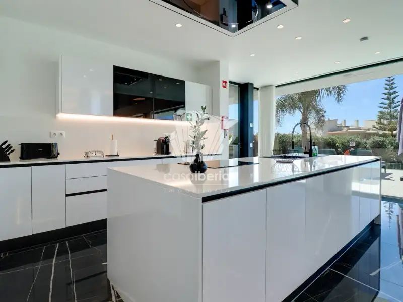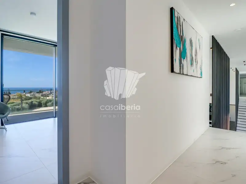 Upon entering, you are greeted by a spacious open plan living and dining room, with an elegant illuminated double staircase. The panoramic views of the sea, the high ceilings that enchant at first glance and the wide sliding glass doors that open onto the magnificent saltwater pool and the outdoor recreation areas create an unparalleled sense of freedom.