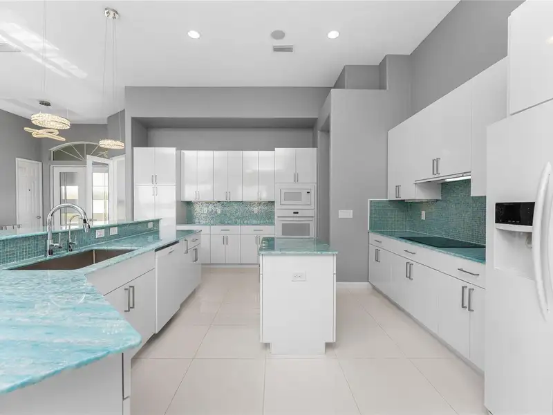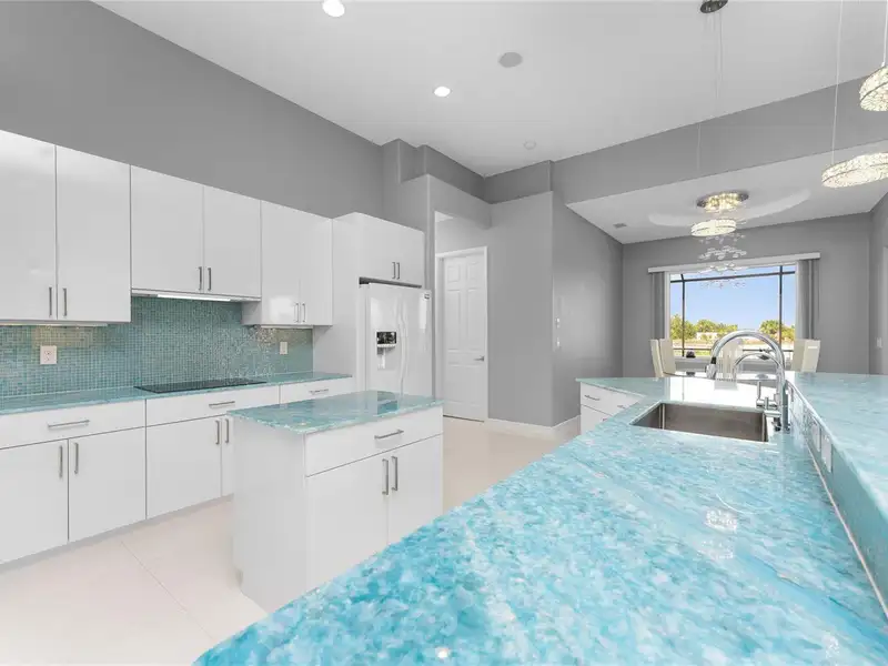 - Gourmet kitchen with aqua onyx countertops