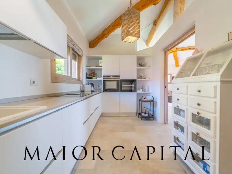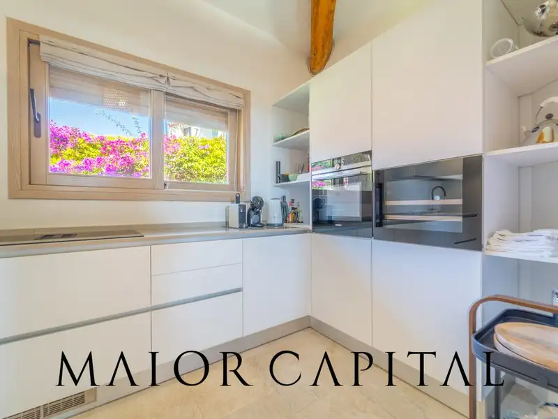 This luxury property stands out for its contemporary Mediterranean style, harmoniously blending traditional elements with modern lines softened by elegant architectural curves. Recently renovated with high-quality finishes, it is spread over two levels. On the main floor, a bright living area with exposed wooden beams and large windows welcomes guests into a sophisticated and welcoming environment. The living area opens to the outside onto a furnished porch, ideal for relaxing or dining at sunset with the scent of the sea.