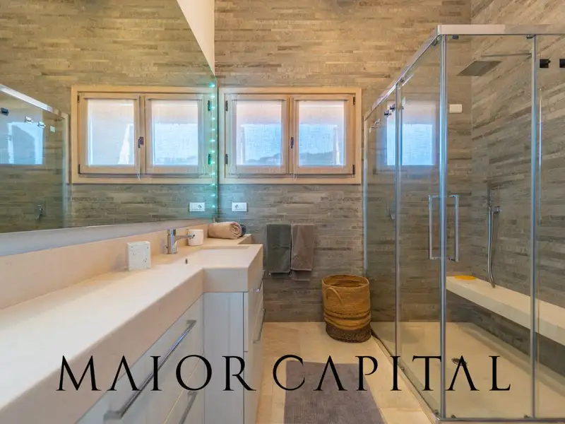 The lower floor, also accessible via an independent entrance, is designed to offer maximum versatility and hospitality. A second spacious living area can be transformed into a private cinema room, ideal for family evenings or entertaining guests in comfort. The sleeping area consists of four bedrooms, each with its own private bathroom, offering high-level accommodation in a private and quiet setting.