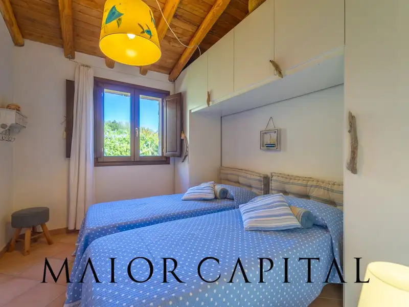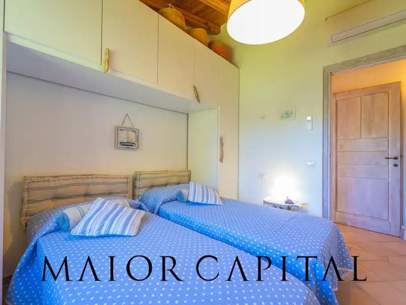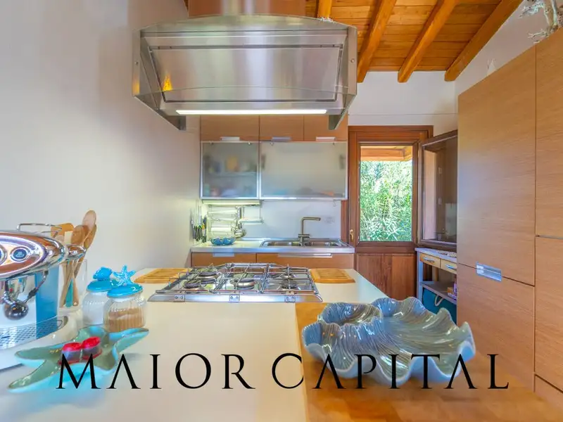 At the entrance, a spacious covered veranda invites you to relax outdoors, providing the ideal place to enjoy sunny days and summer evenings with a unique view of the garden and the sea. Inside, the living area features a spacious living room with a fully equipped kitchen, bright and airy, perfect for entertaining guests or relaxing with the family.