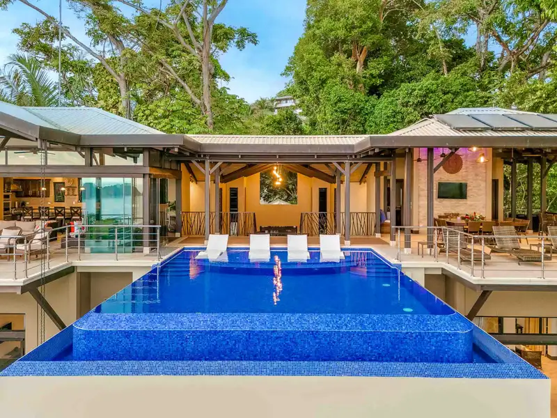 Perched above the Pacific coastline and just a short walk from the beach via a private trail, this 8-bedroom, 11,000 sq. ft. plus estate was designed for entertaining and hosting large groups, comfortably accommodating up to 24 guests. The home’s crown jewel is its expansive top-floor social and entertainment level, featuring a spectacular three-sided infinity pool with uninterrupted views of the Pacific Ocean and Manuel Antonio’s lush rainforest. There is a climate-controlled chef's kitchen, dining and living space which comprises one half of this amazing space set into the rainforest canopy, and the other half is an open-air grill, dining and entertainment space from which you can dine, dance or just relax and marvel at the views and wildlife.