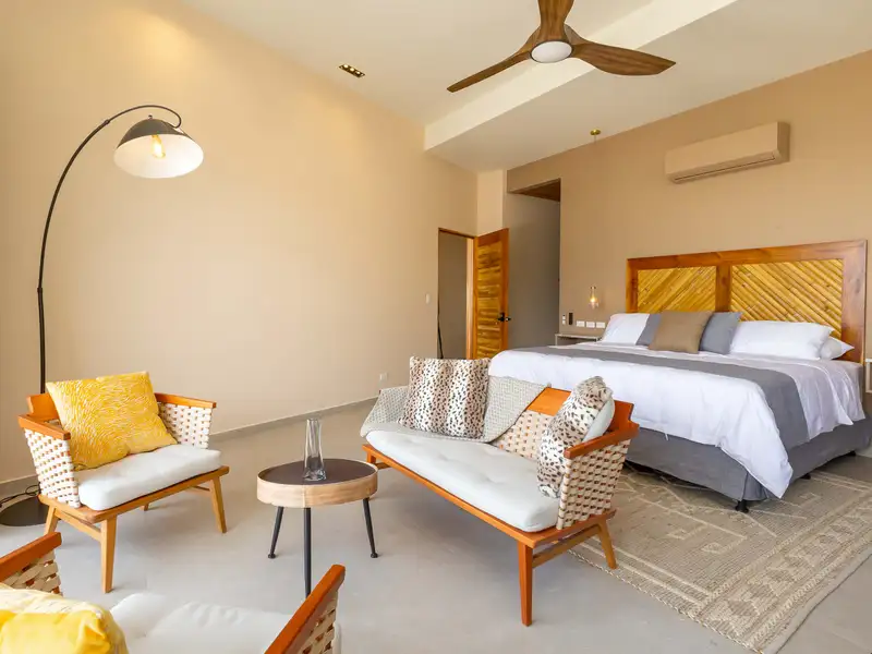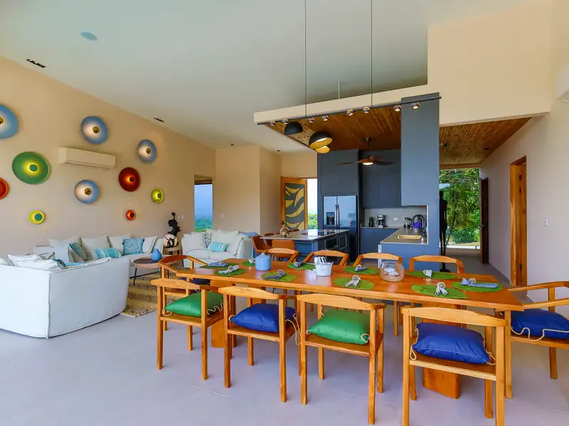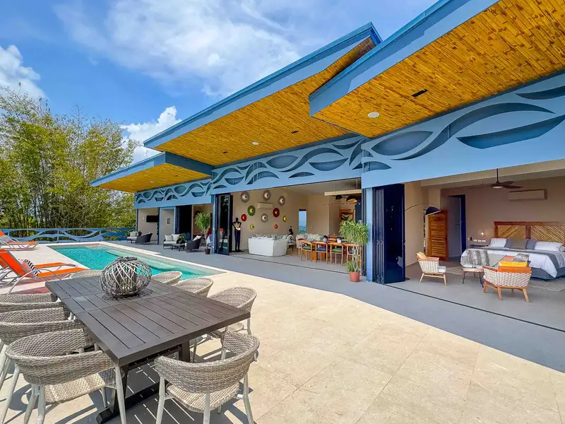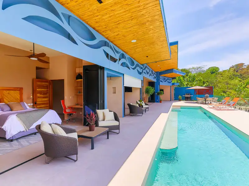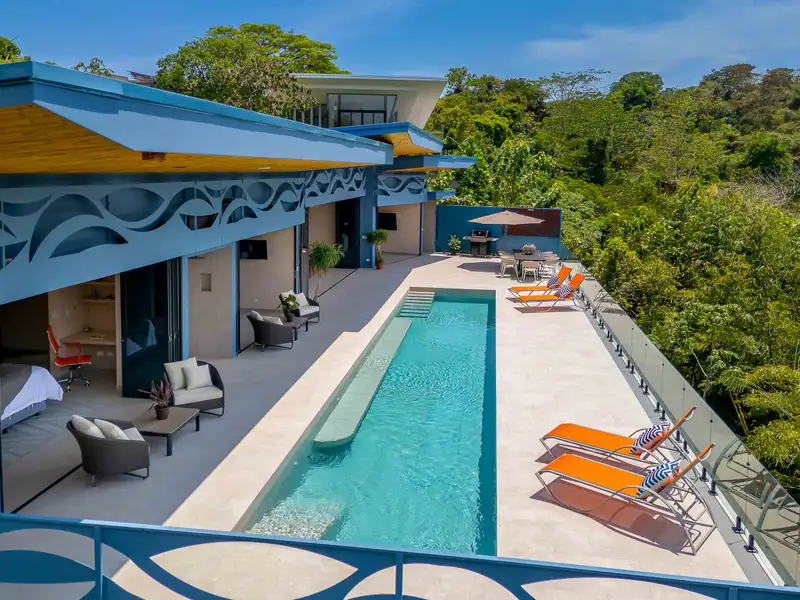 Step inside and be captivated by panoramic views of the Pacific Ocean, its coastal white water views stretching towards the horizon. On the opposite side, vibrant green mountains rise to meet the sky, painted with the golden hues of sunrise each morning. This is a place where nature's beauty takes center stage, making it one of the most sought-after Manuel Antonio luxury homes.