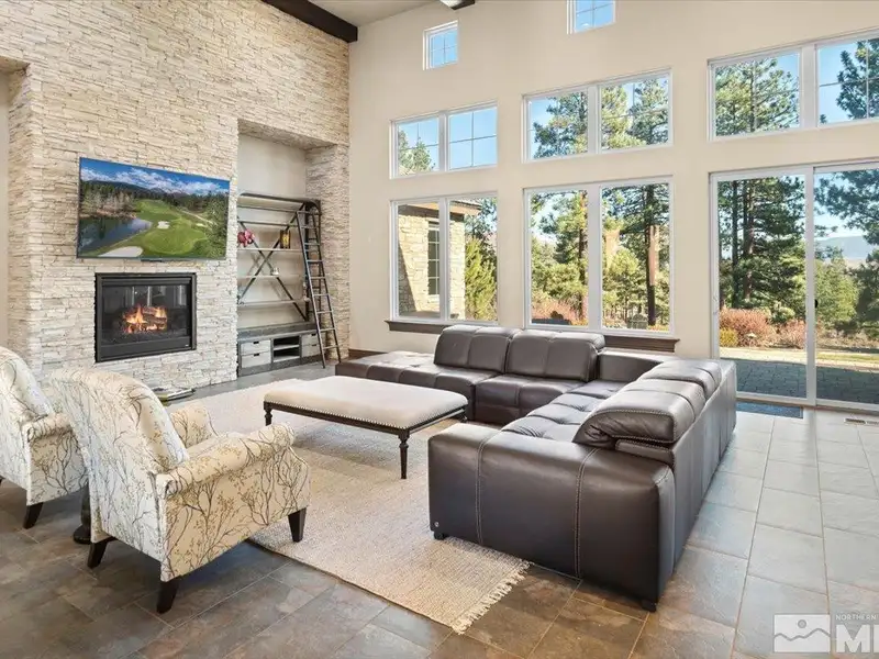 - Floor-to-ceiling stone fireplace