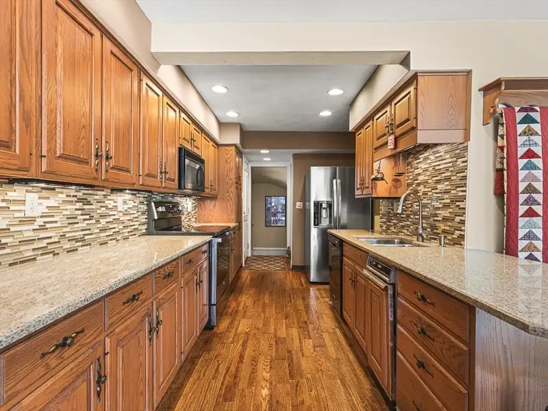 - Kitchen with quartz counters and tile backsplash
