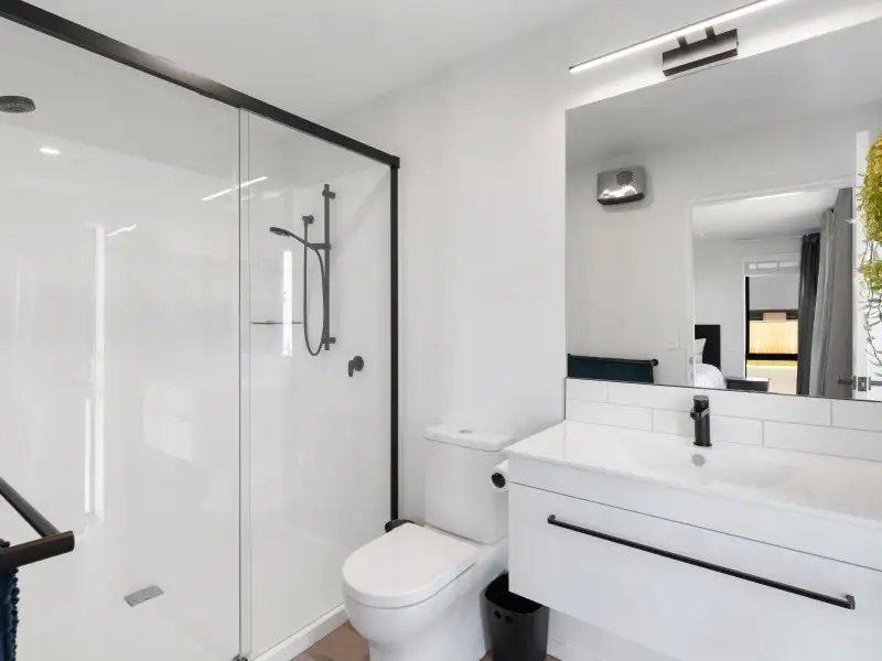 Self-contained with open-plan living, heat pump quality Bosch kitchen appliances, bathroom with shower, toilet & laundry cupboard. Ideal for guests, extended family, or independent living.