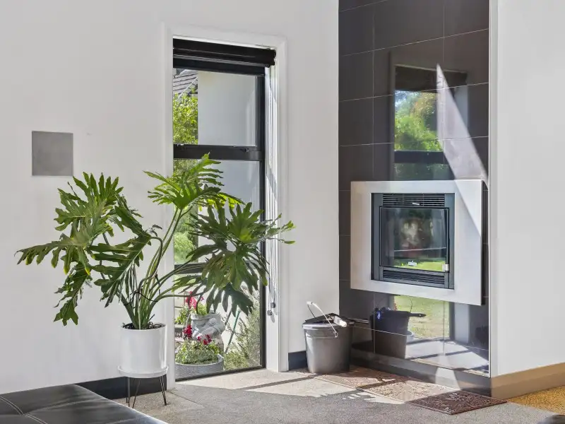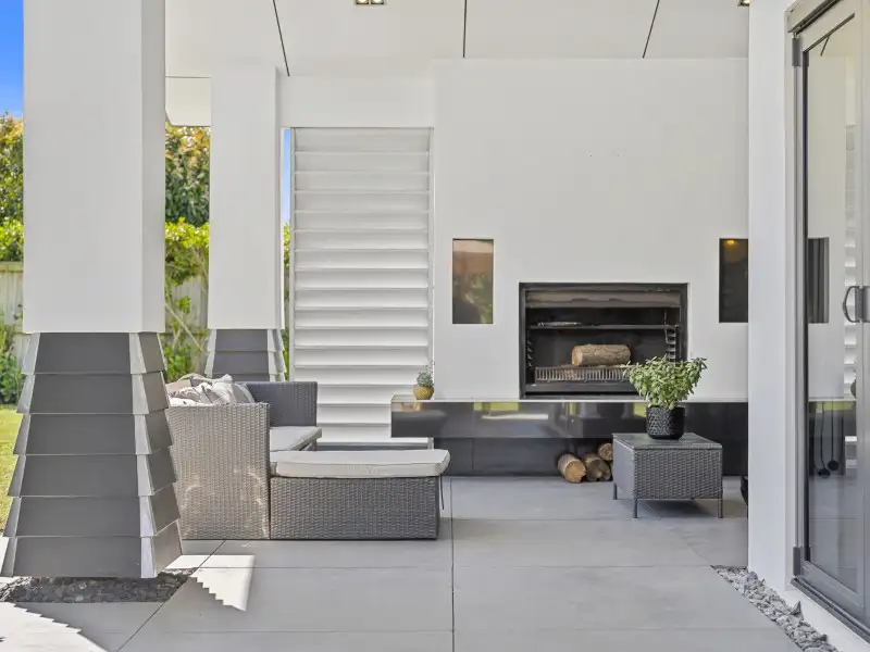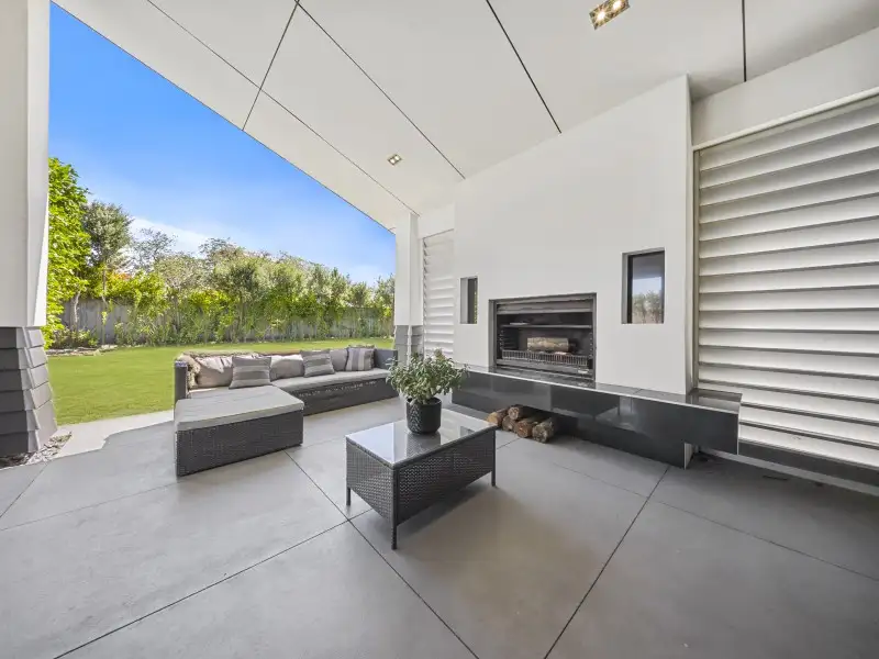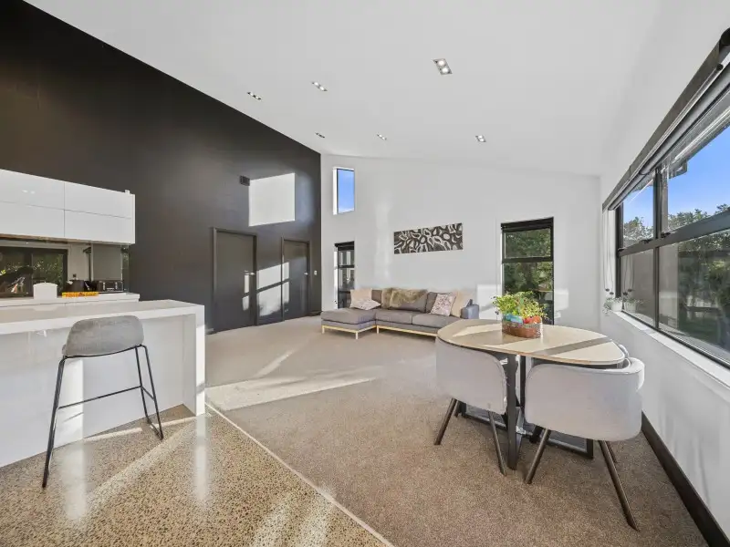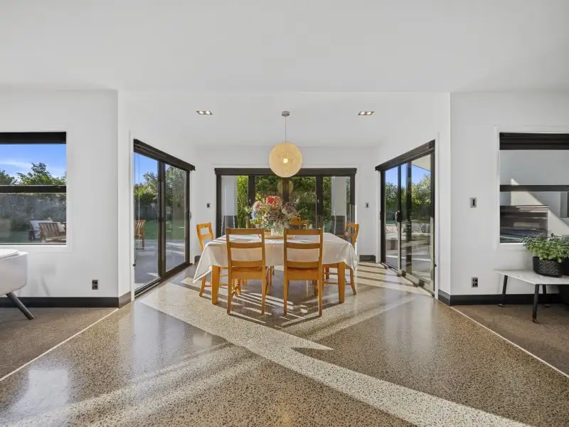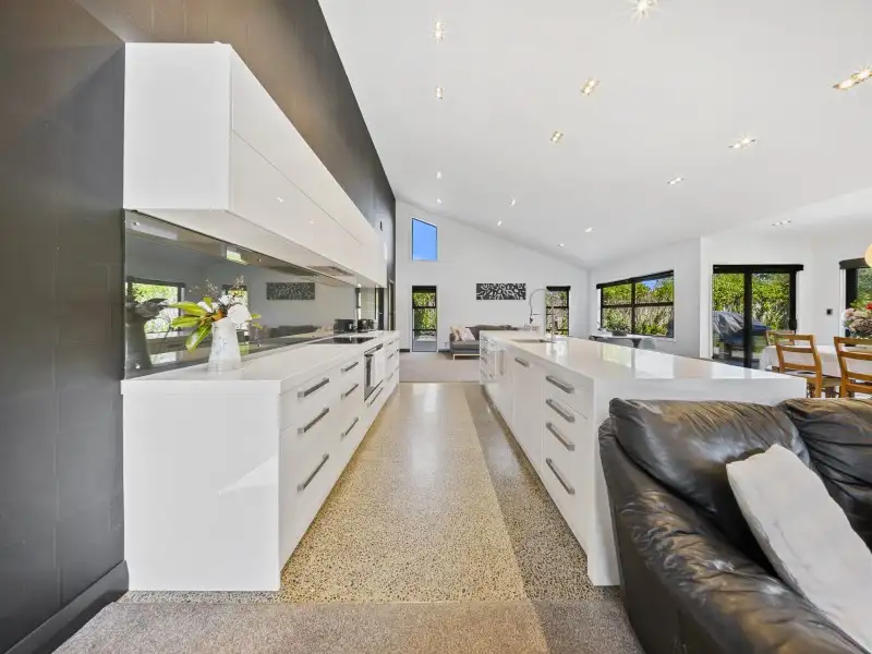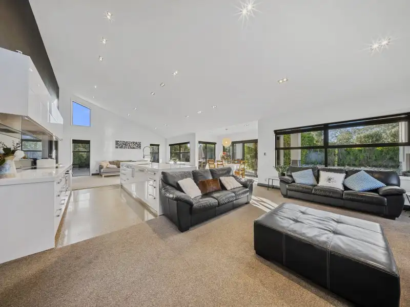 The open-plan kitchen, dining and living area forms the heart of the home - light-filled and spacious, with seamless flow to the outdoor living zone complete with open fire, water feature, and a sun-soaked north-facing lawn.