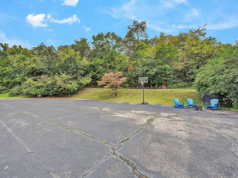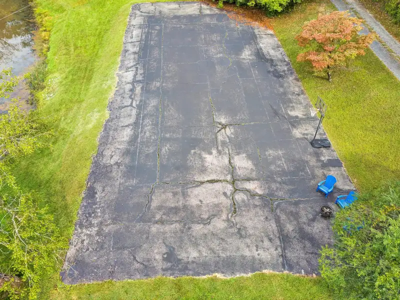 - Large paved parking, former tennis court