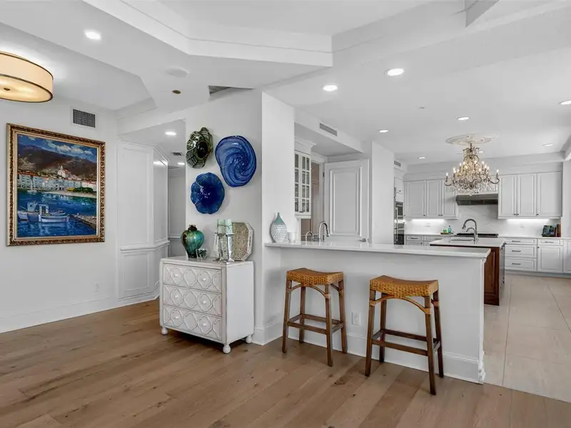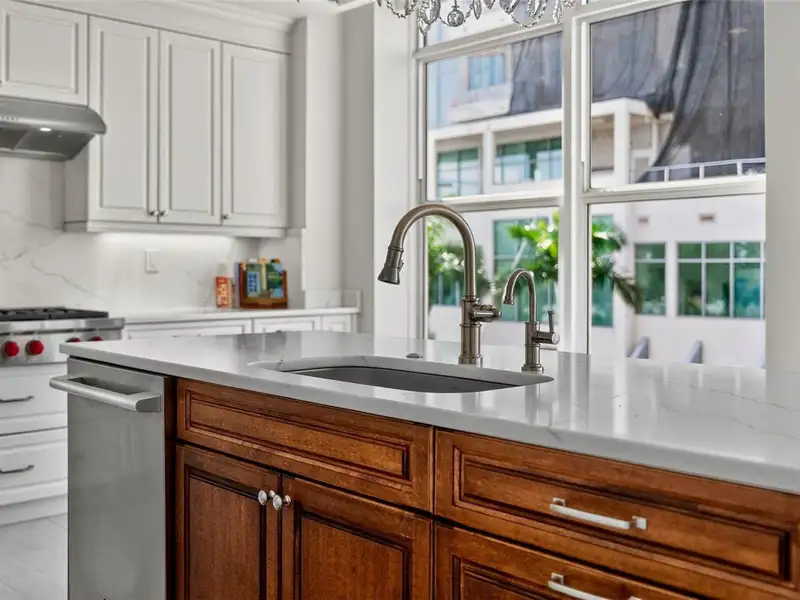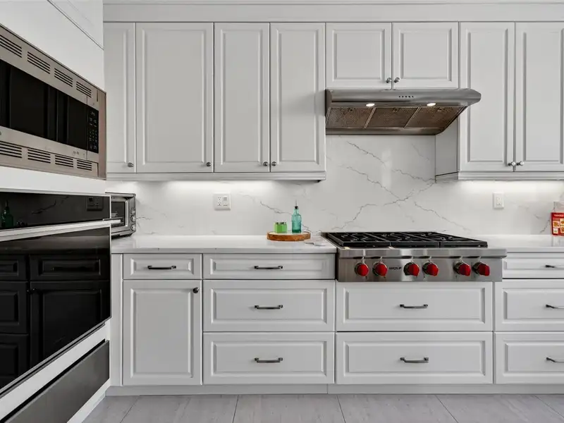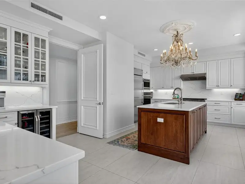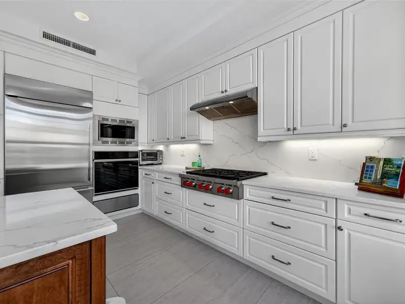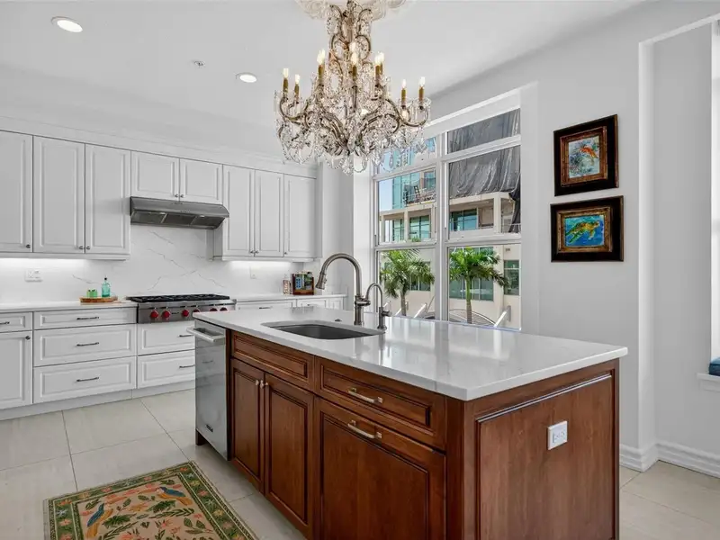 - Chef’s kitchen with Wolf gas range, quartz counters
