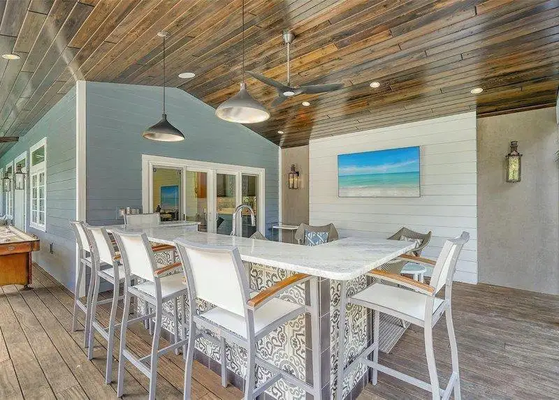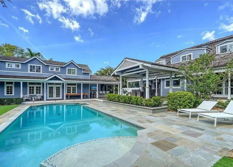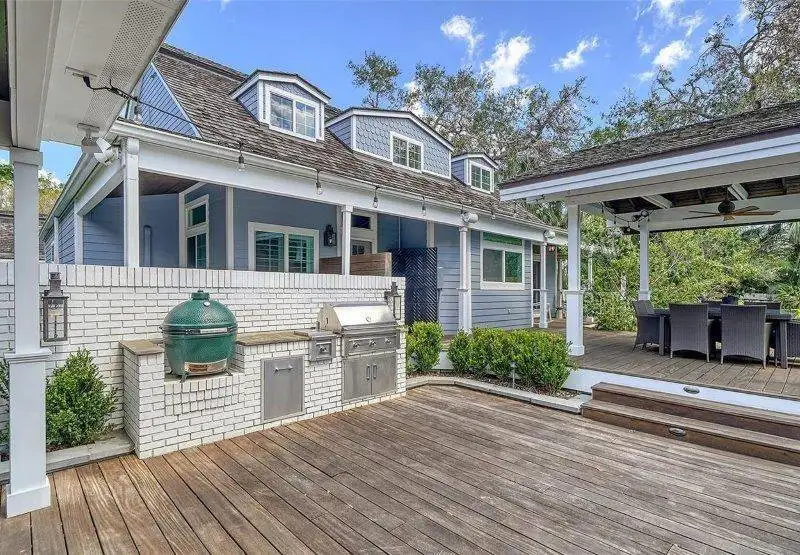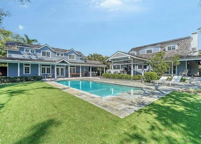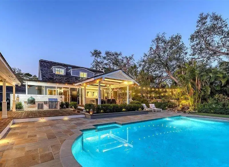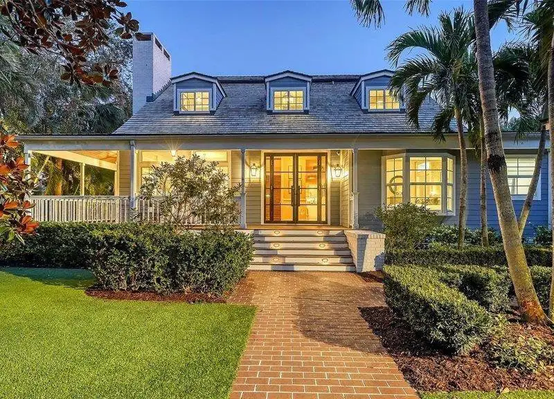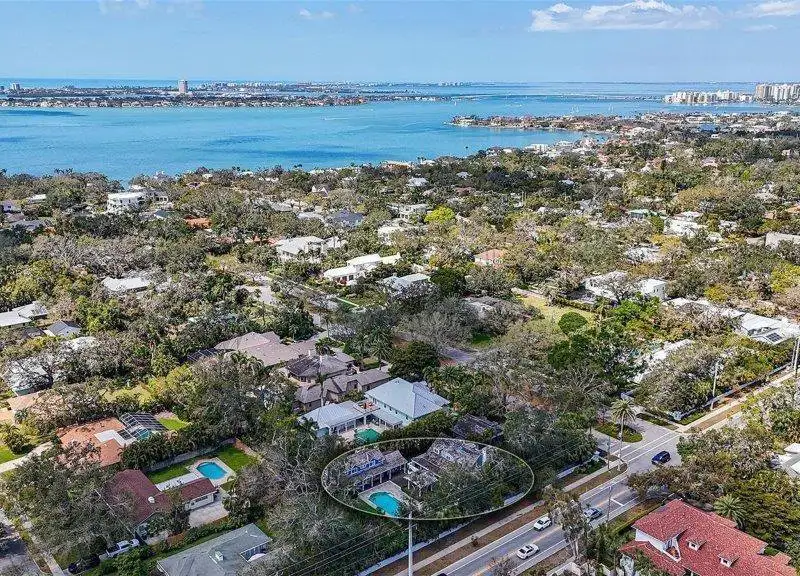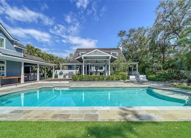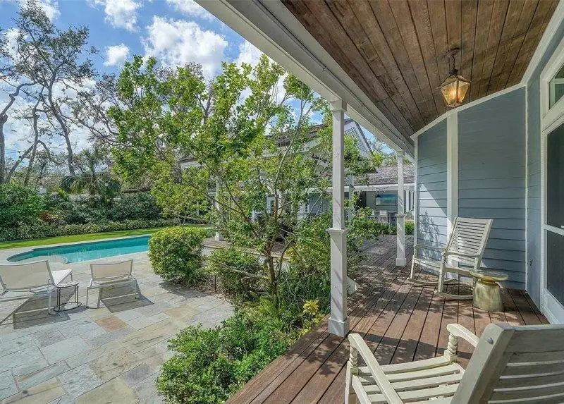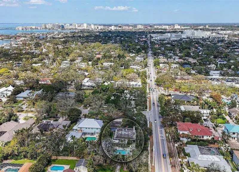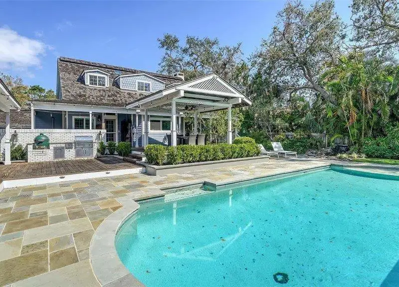 Welcome to this rarely available Cape Cod–style residence, comprised of a masterfully renovated main house and separate luxe guest house poised on an expansive 20,000 sq. ft. lot in Sarasota’s prestigious Cherokee Park. Elevated 23 feet above sea level and nestled on a wide, tree-lined street in the coveted West of Trail district—within the top-rated Southside school zone—this 4-bedroom, 3 full/2 half bath +office private compound blends timeless architecture with designer-curated sophistication. A stately front porch framed by lush landscaping and classic brick walkway introduces the home with understated grandeur. Handcrafted, glass-inlaid iron double doors open to a refined foyer where natural light, elegant millwork, and soaring 10-foot ceilings set the tone for the bespoke interiors beyond. Inside, original hardwood floors, designer lighting by Arteriors, Eichholtz, and Kelly Wearstler, and high-end finishes selected by Chelsea Dunbar of Blu Interiors create a sense of warmth and refinement throughout. The quartz-clad chef’s kitchen is as functional as it is beautiful, featuring a Wolf natural gas range, KitchenAid French-door refrigerator, ample pantry space, and custom cabinetry—perfectly suited for both intimate dining and entertaining. Anchored by a wood-burning fireplace, the main living and dining spaces flow seamlessly outdoors to an inviting Pennsylvania bluestone patio, low-maintenance Astroturf lawn, and wrap-around Brazilian teak deck—an idyllic setting for year-round enjoyment. The serene first floor primary suite is a private retreat showcasing three custom-designed walk-in closets and a spa-inspired bath with marble finishes, dual vanities, heated towel bar, and a zero-entry shower with body sprays. Ascend the custom staircase to find 2 tailored guest retreats with spa-like bath, each offering serene views and thoughtfully appointed details for ultimate comfort and privacy. Throughout the home, custom wallcoverings by Phillip Jeffries, Scalamandré, and Élitis add layers of texture and artistry, while upgraded systems—including a surround sound system, six climate zones, and multiple laundry areas—enhance everyday comfort. Resort-style living continues outdoors with a 9-foot-deep pool framed by classic Bevolo gas lanterns and an extraordinary luxury guest house built in 2016. This refined space includes an entertaining area with custom built-ins, full bar, refrigerator drawers, Scotsman icemaker, private guest suite, 1.5 baths, gym, and an outdoor teak shower. The fully equipped outdoor kitchen features a natural gas Lynx grill, XL Green Egg, quartzite prep counters, and a covered gazebo ideal for al fresco dining. All impact doors and windows, cedar shake roof, and Hardie Board siding add to the beauty and durability of the home. Completing this exceptional estate is an oversized 2.5-car detached garage and secure, fully fenced grounds with electric fence. Enjoy tree-lined streets with sidewalks and a true sense of community, all just a short stroll or golf cart ride to Southside Village where residents enjoy boutique shops, Morton’s Gourmet Market, cafés, and top-rated restaurants, and minutes from downtown Sarasota and Siesta Key Beach. This is refined Gulf Coast living—where timeless architecture meets effortless luxury in one of Sarasota’s most treasured neighborhoods.