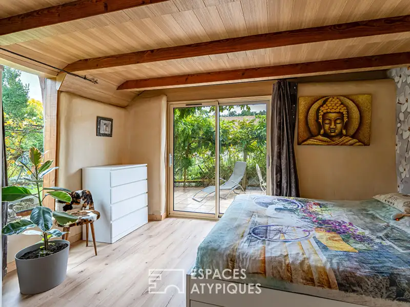 The garden, a true haven of biodiversity, reveals a pond and a sunny terrace.