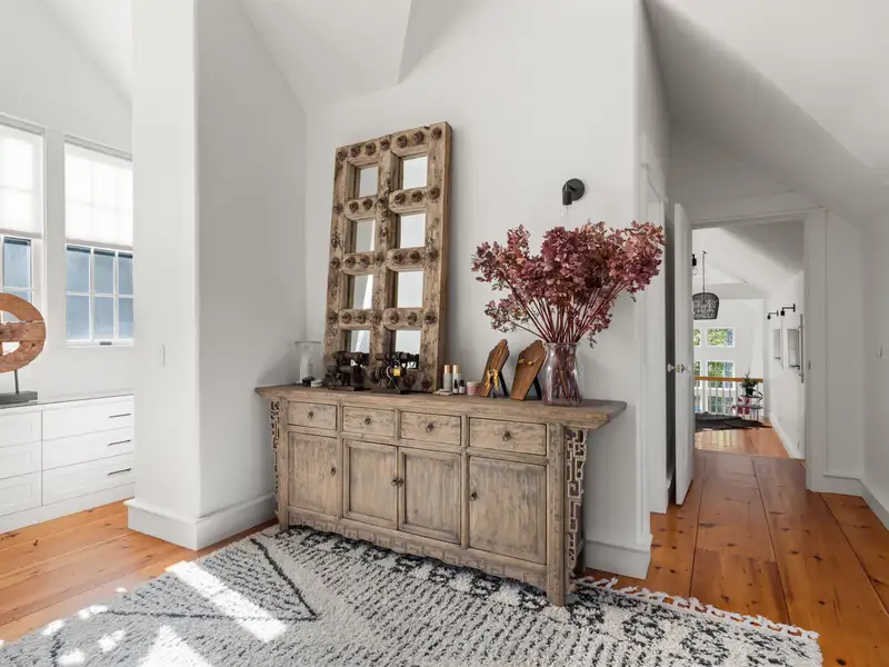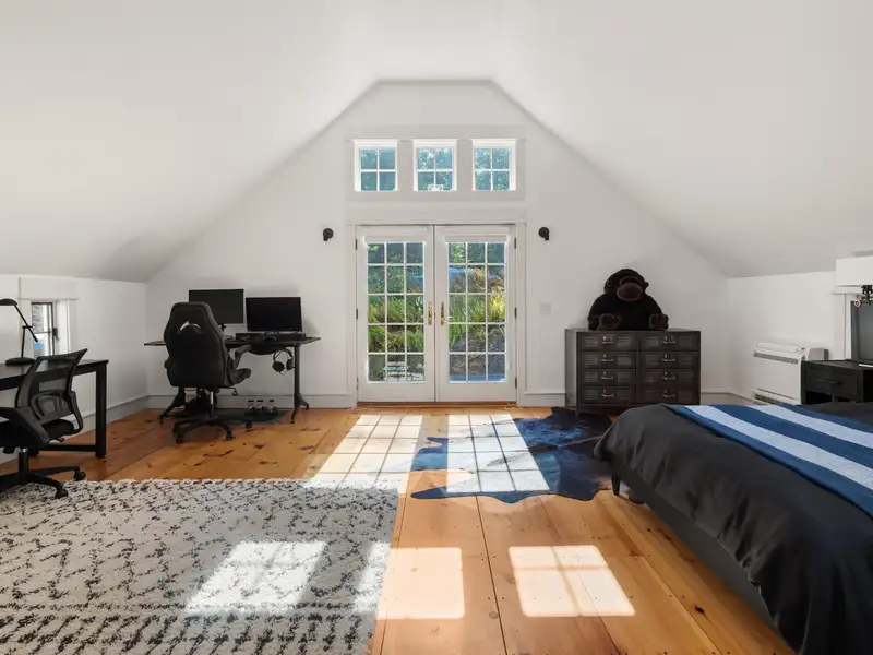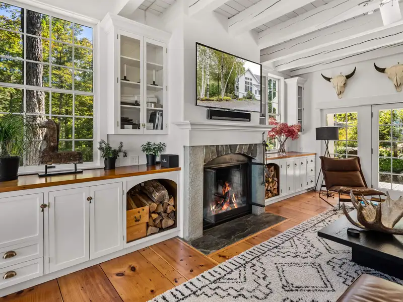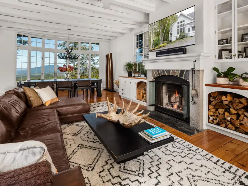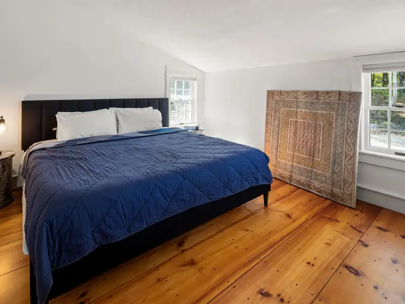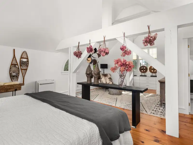 - Wide-plank pine floors with alpine décor