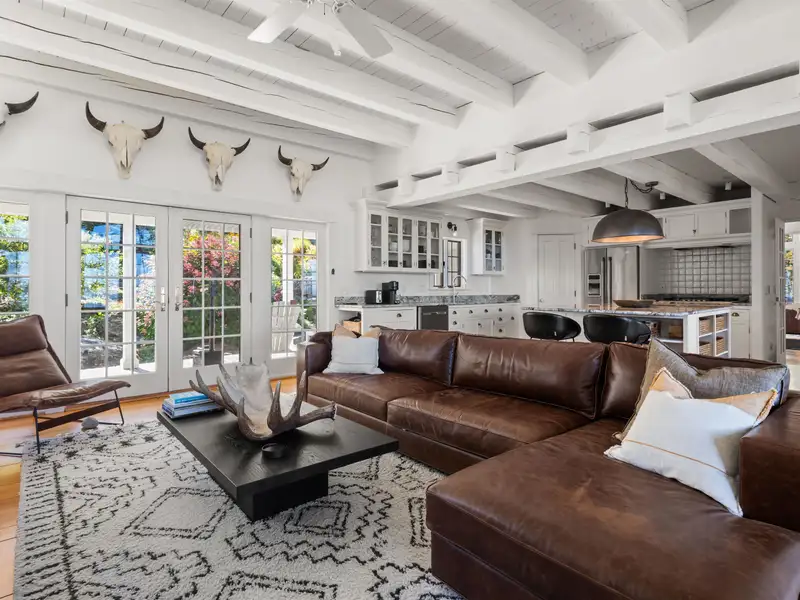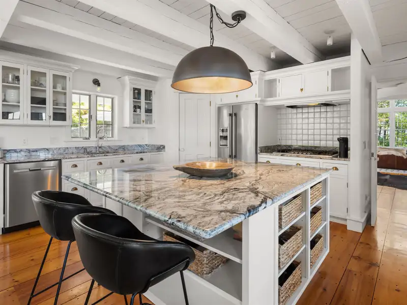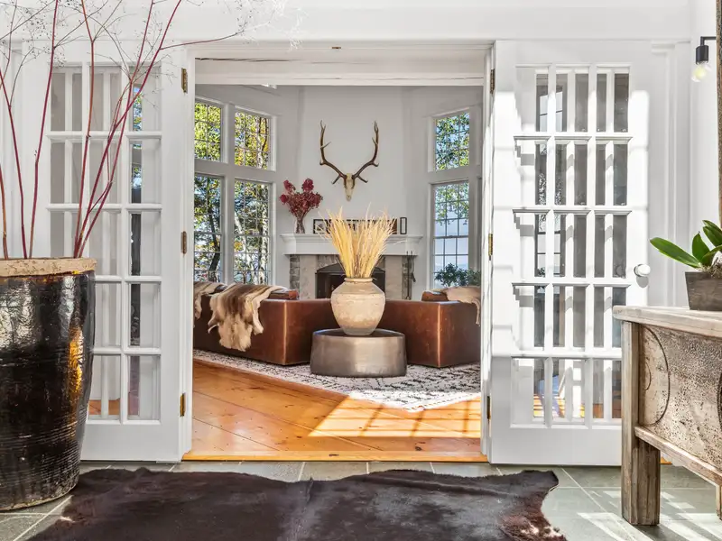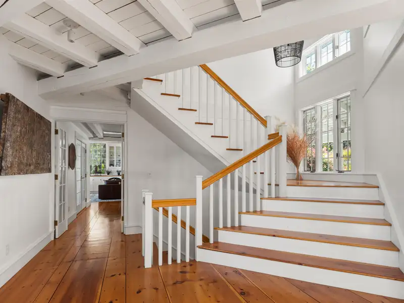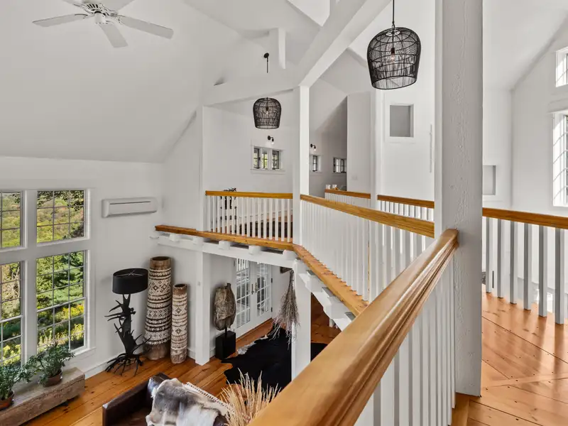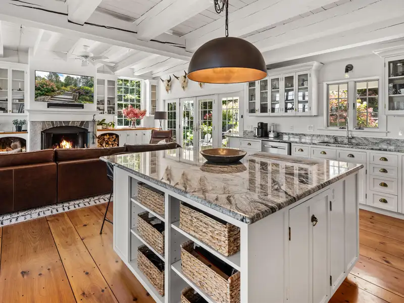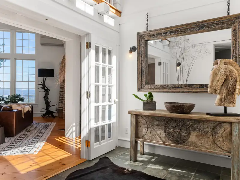 - Wide-plank pine floors with alpine décor