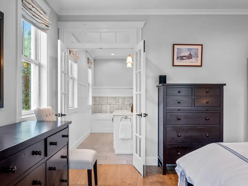 - First-floor primary suite with dual walk-in closets