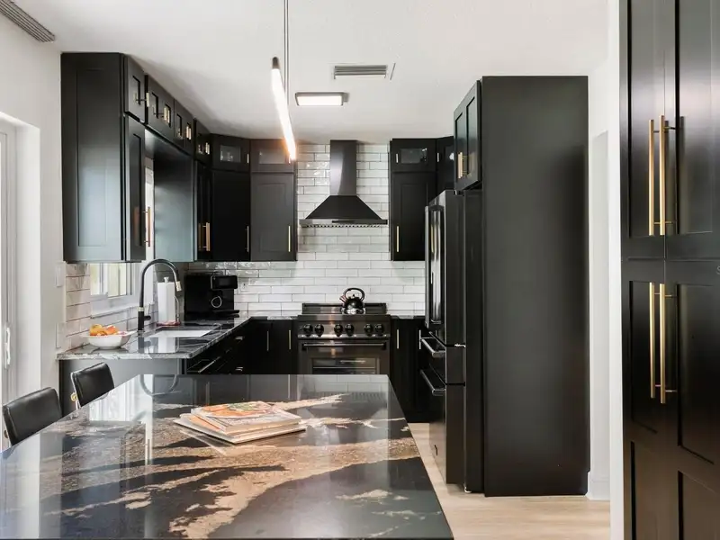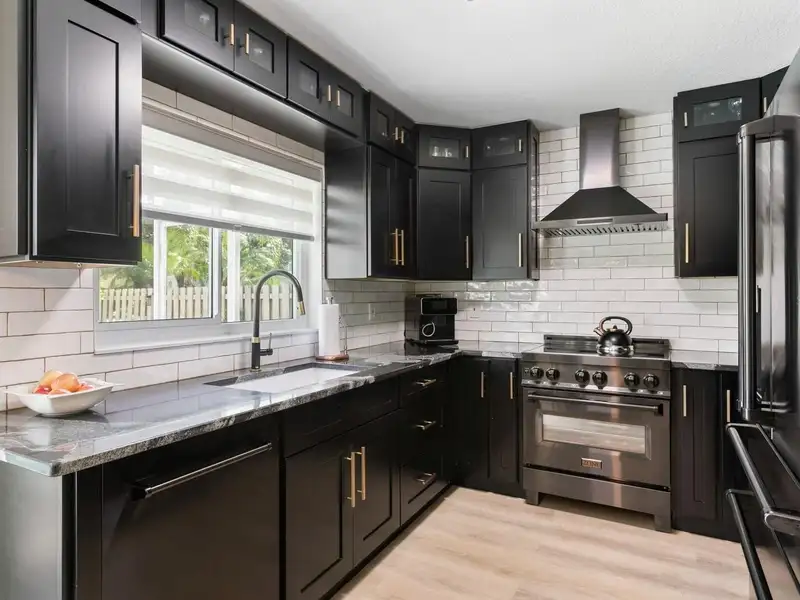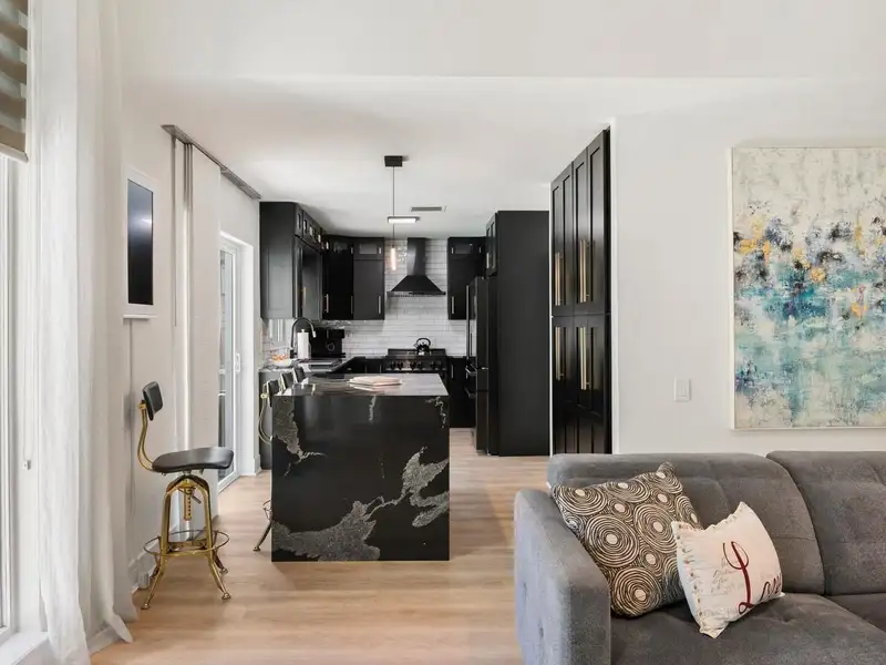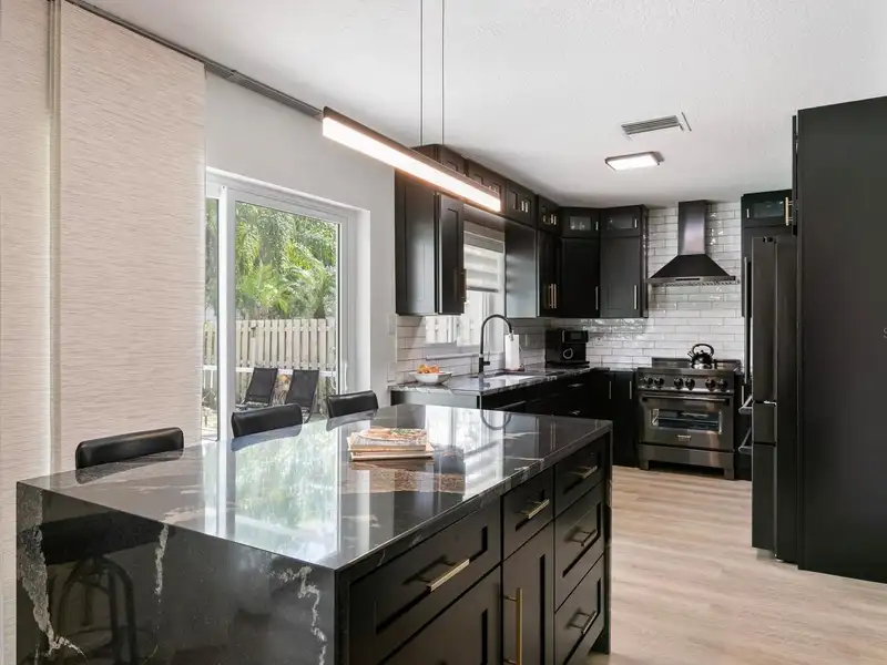 The renovated chef’s kitchen includes custom cabinetry with Brazilian granite counter tops to all surfaces, dual spice racks, lazy Susans, a deceptive large pantry storage, premium Z-Line appliances, which includes an induction stove top oven, a panel-ready ice fridge, microwave/oven combo and a waterfall island with storage that is pre-wired for an under-counter refrigerator, making it a perfect effortless transition to entertaining.