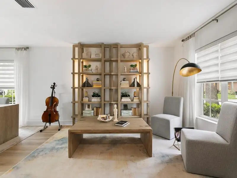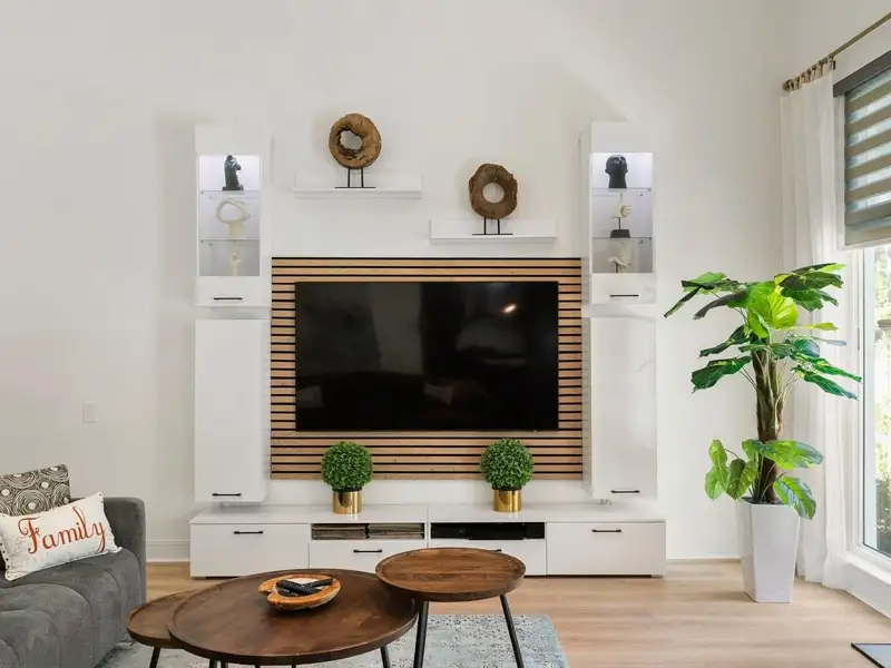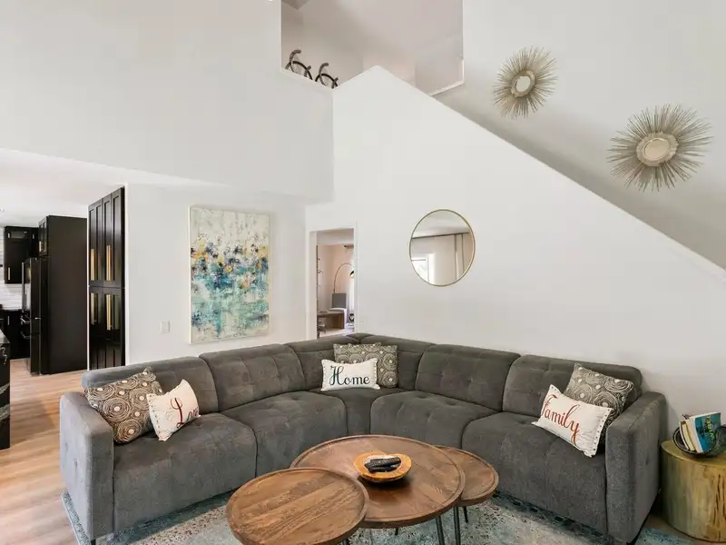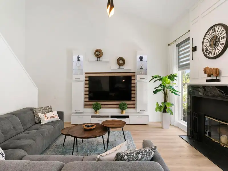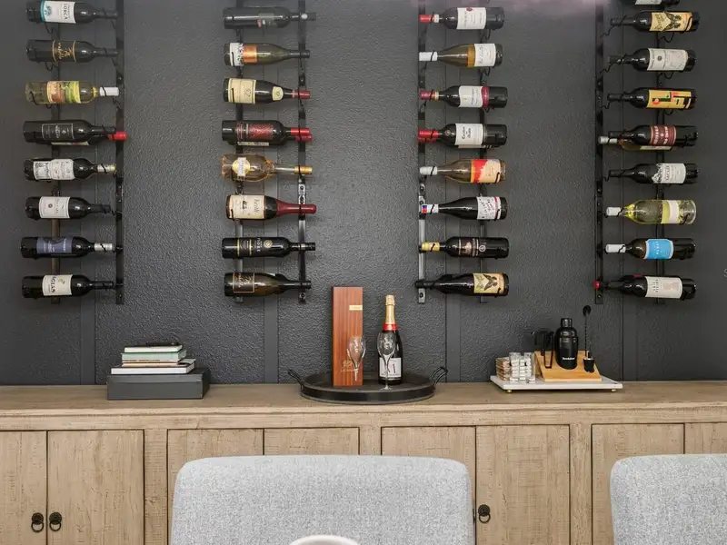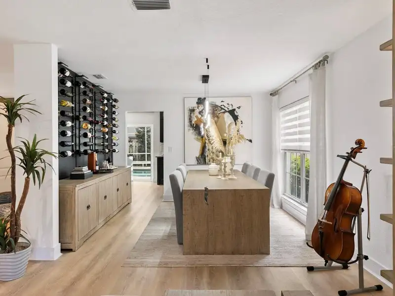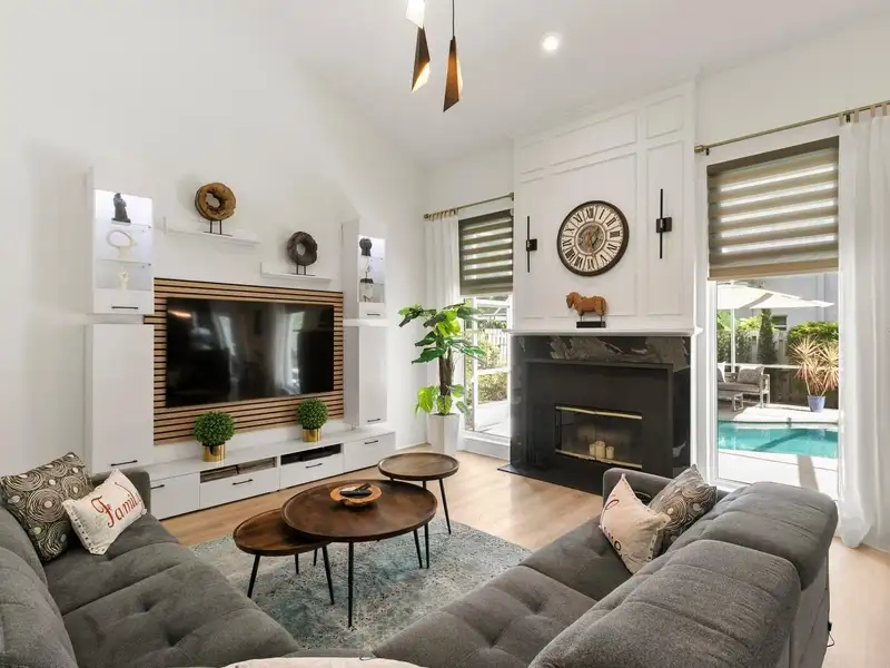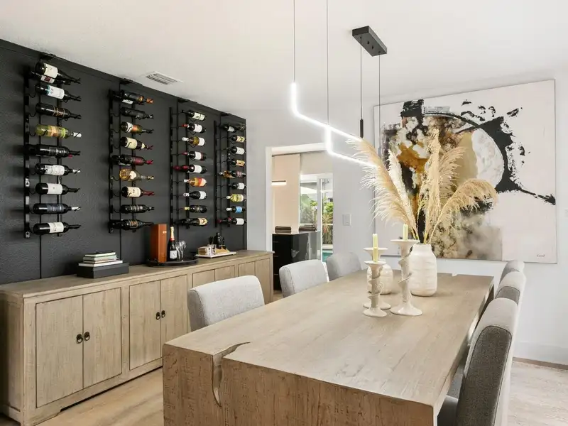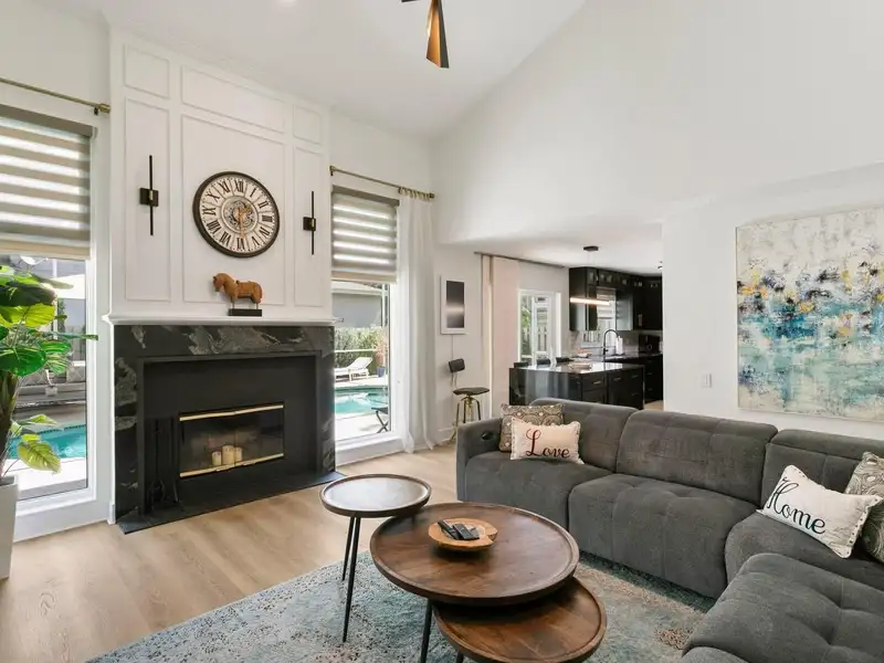 The newly opened living and formal dining room features a striking custom wine display wall that doubles as art display. The family room is a showstopper with soaring 18-foot ceilings that create a grand sense of scale. A custom wood-burning Brazilian granite fireplace serves as the focal point, framed by contemporary lighting, designer wall moldings, and a built-in display