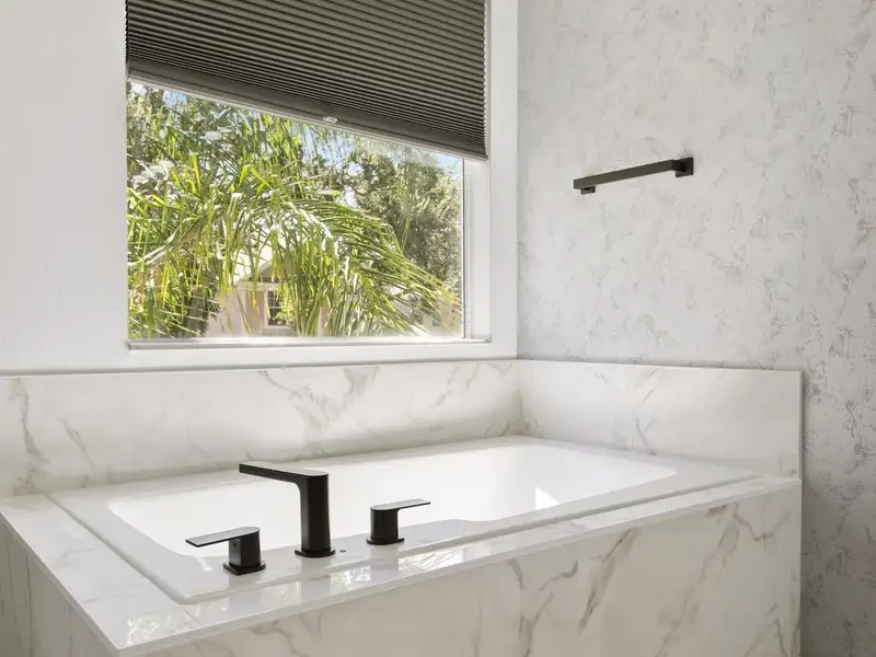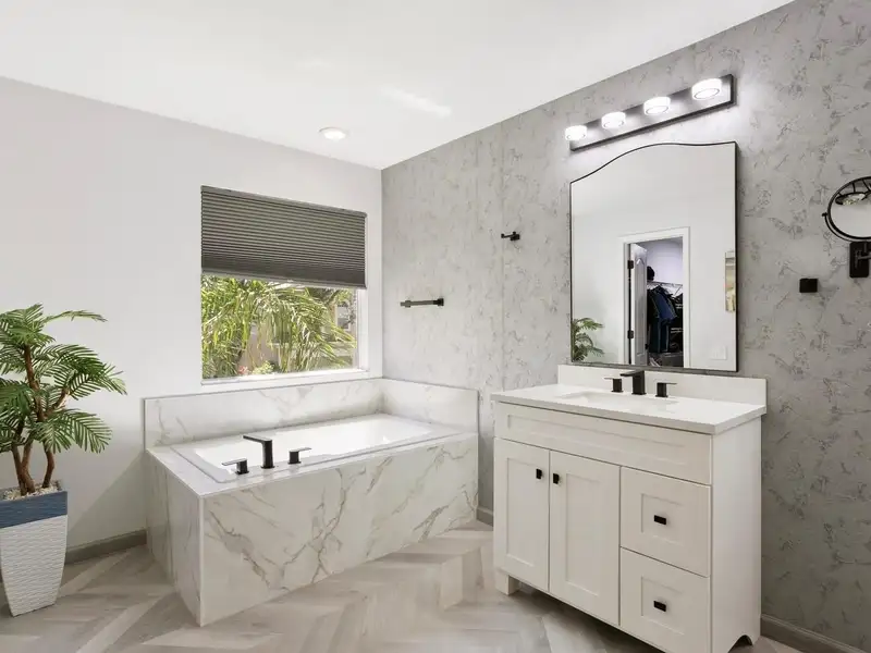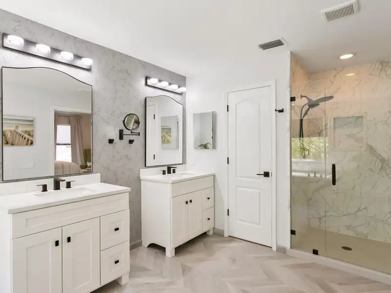 Upstairs, the primary suite offers a spa-inspired bath with custom shower, tiled soaking tub, dual vanities, large walk-in closet and updated flooring. The guest bath is equally impressive with sleek Italian tile and designer fixtures. An updated second floor laundry room with Italian tile is conveniently located. All bedrooms include high end accent wall coverings.