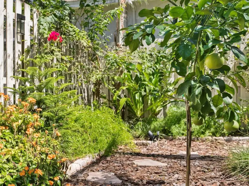 The exterior has been thoughtfully designed with a combination of mature and new professional landscaping, solar uplighting that highlights the architecture and trees at night, and a fenced in yard for added privacy.