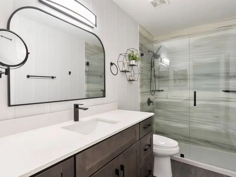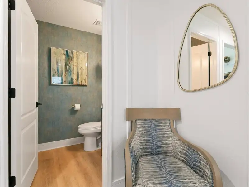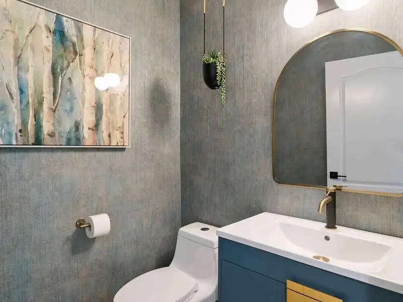 wall with cabinetry and soft uplighting and a remodeled powder room.