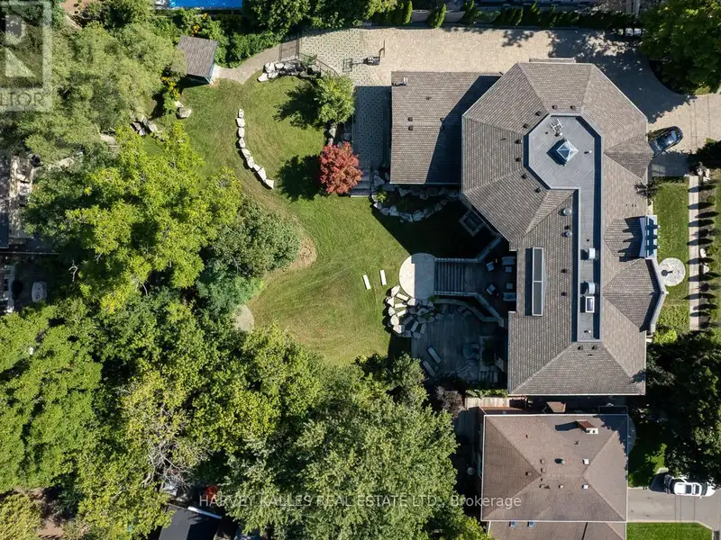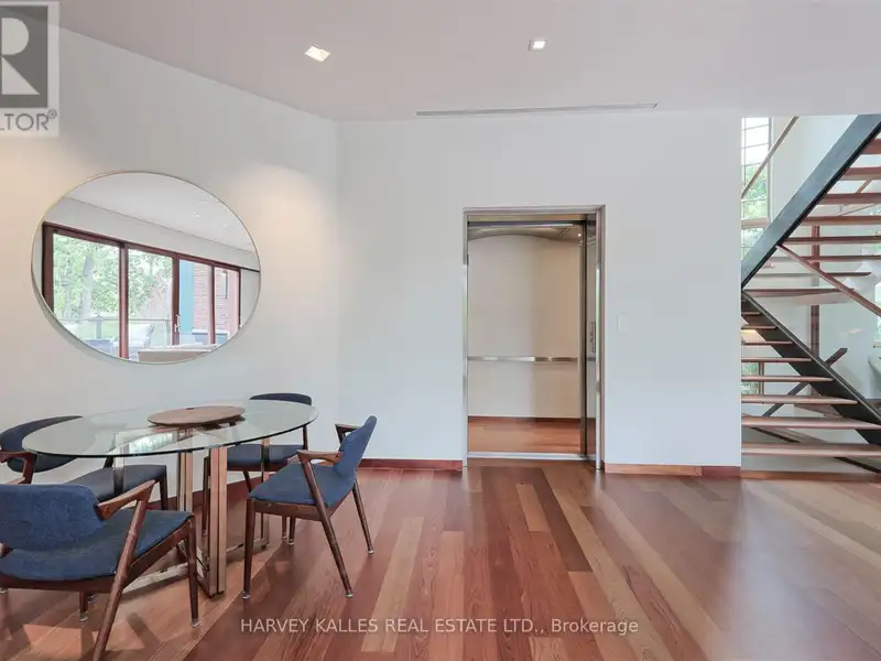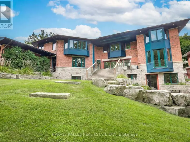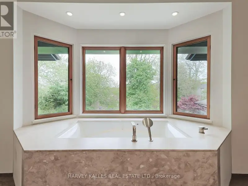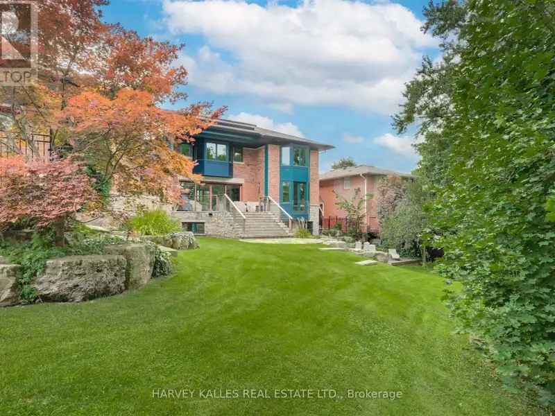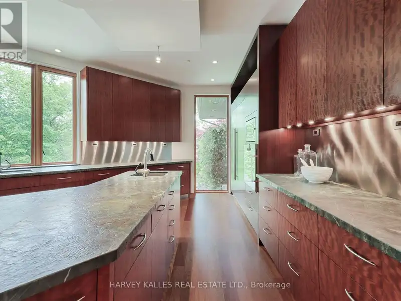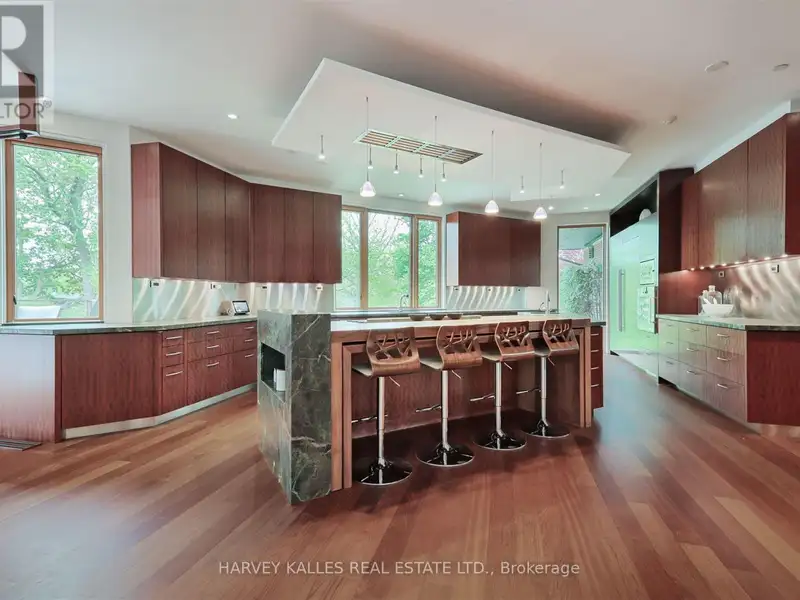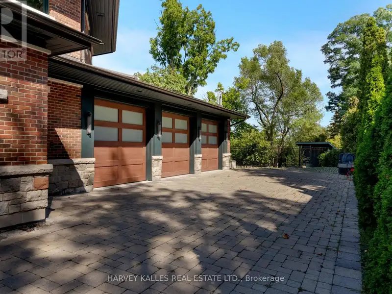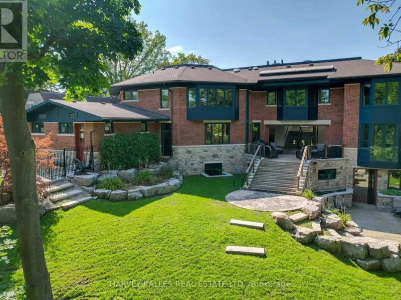 Discover a gem, custom-built as a multi-generational home, offering over 11,000 sq ft of luxurious living space on a rare 125ft double lot at the edge of the Humber Valley in the tree-lined Kingsway neighbourhood. This residence is a statement of contemporary elegance and sophistication, perfect for the discerning family.Inside, experience clean lines and exquisite details that enhance comfortable luxury living, including sound-isolated suites, Jatoba hardwood floors, stunning Persian serpentinite kitchen countertops, and heated stone floors for ultimate comfort.Accessibility is a key feature, with snow melt for the front porch, steps, ramp and driveway, a commercial 4x6 ft elevator, and 4 ft wide hallways to ensure effortless movement throughout the residence.The ground floor features a bright, open-plan living area that seamlessly integrates the chefs kitchen, dining, and living spaces, extending to a partially covered upper deck with a 17ft wide opening. A heated 3-car garage is cleverly positioned at the side of the house.The primary retreat is where luxury meets tranquility, featuring two generous walk-in closets and two ensuites one complete with a massage room and whirlpool tub offering tree-top views. Two additional spacious bedrooms, each with walk-in closets, share a thoughtfully designed bathroom suite with dual sinks, ample storage, and a separate area for added privacy. The oversized fourth bedroom also includes its own ensuite bathroom and walk-in closet, providing comfort and convenience for family or guests.The ground floor bedroom suite with a Juliet balcony offers a perfect retreat for guests.Venture to the finished lower level, where 10+ ft ceilings create a light and airy ambiance.This expansive space features a wide sliding door leading to the lower deck, ideal for entertaining.With multiple entertainment areas, including a stepped home theatre and sprawling park-like backyard, this home is designed for those who appreciate spacious comfort. (id:6370)
