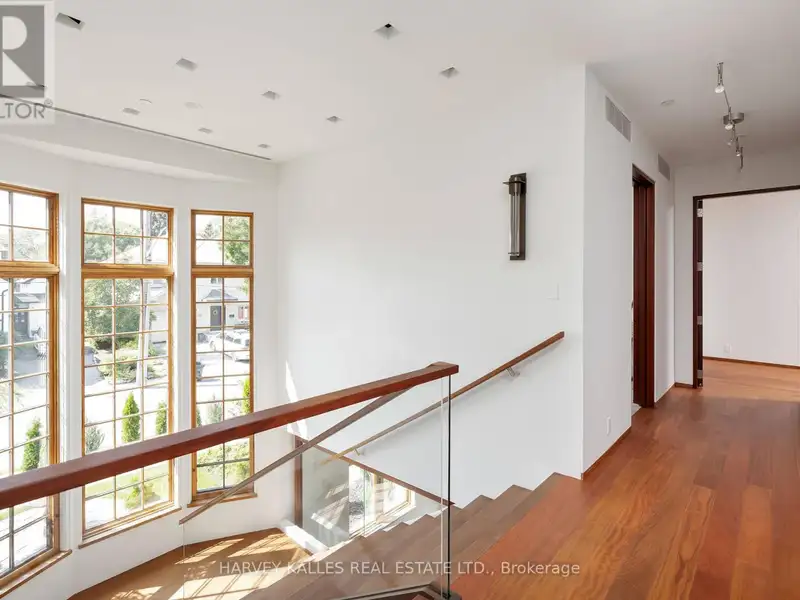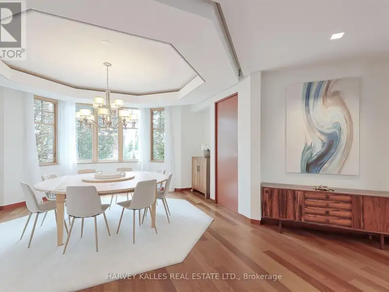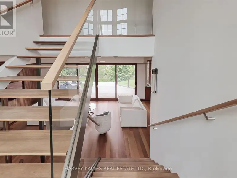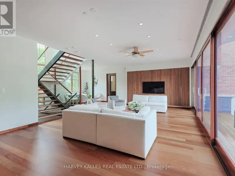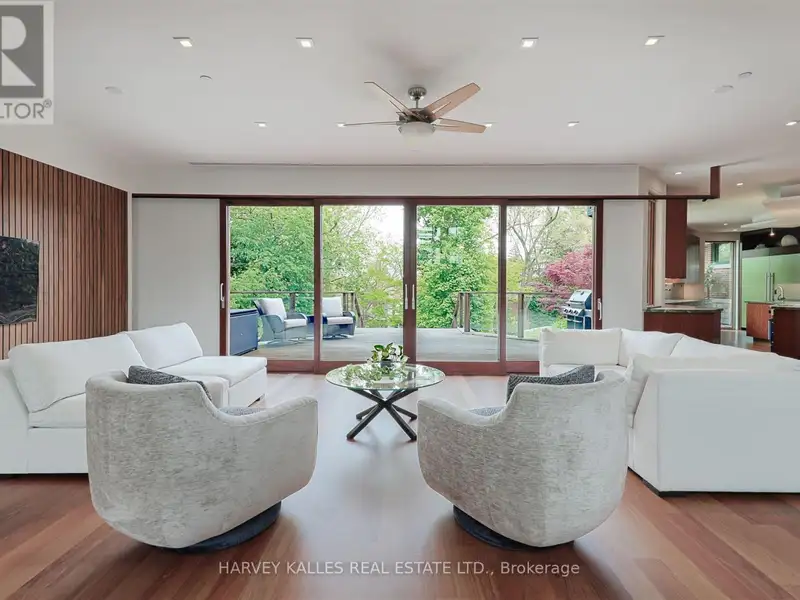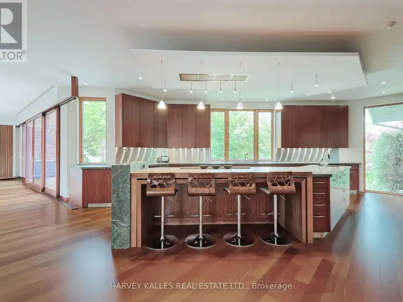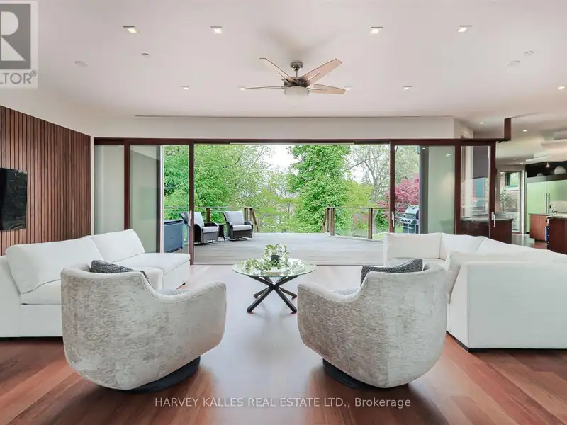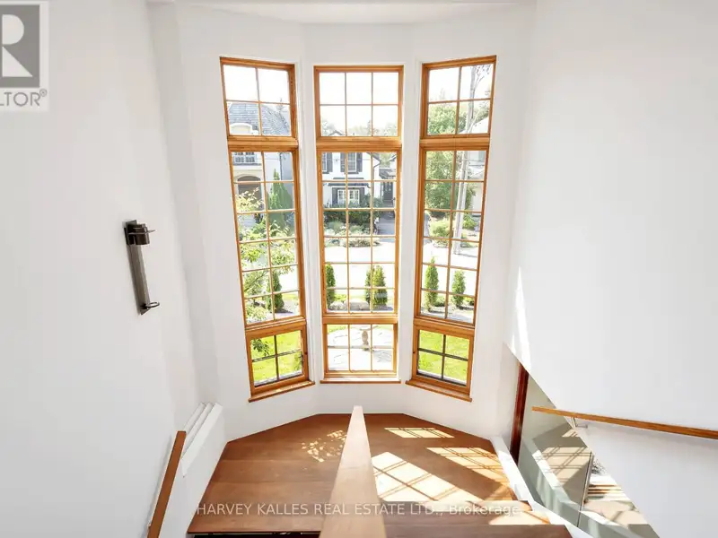 Discover a gem, custom-built as a multi-generational home, offering over 11,000 sq ft of luxurious living space on a rare 125ft double lot at the edge of the Humber Valley in the tree-lined Kingsway neighbourhood. This residence is a statement of contemporary elegance and sophistication, perfect for the discerning family.Inside, experience clean lines and exquisite details that enhance comfortable luxury living, including sound-isolated suites, Jatoba hardwood floors, stunning Persian serpentinite kitchen countertops, and heated stone floors for ultimate comfort.Accessibility is a key feature, with snow melt for the front porch, steps, ramp and driveway, a commercial 4x6 ft elevator, and 4 ft wide hallways to ensure effortless movement throughout the residence.The ground floor features a bright, open-plan living area that seamlessly integrates the chefs kitchen, dining, and living spaces, extending to a partially covered upper deck with a 17ft wide opening. A heated 3-car garage is cleverly positioned at the side of the house.The primary retreat is where luxury meets tranquility, featuring two generous walk-in closets and two ensuites one complete with a massage room and whirlpool tub offering tree-top views. Two additional spacious bedrooms, each with walk-in closets, share a thoughtfully designed bathroom suite with dual sinks, ample storage, and a separate area for added privacy. The oversized fourth bedroom also includes its own ensuite bathroom and walk-in closet, providing comfort and convenience for family or guests.The ground floor bedroom suite with a Juliet balcony offers a perfect retreat for guests.Venture to the finished lower level, where 10+ ft ceilings create a light and airy ambiance.This expansive space features a wide sliding door leading to the lower deck, ideal for entertaining.With multiple entertainment areas, including a stepped home theatre and sprawling park-like backyard, this home is designed for those who appreciate spacious comfort. (id:6370)