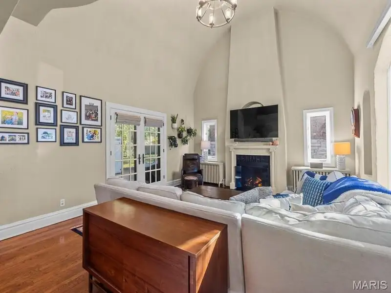 - Living room with vaulted ceiling and balcony