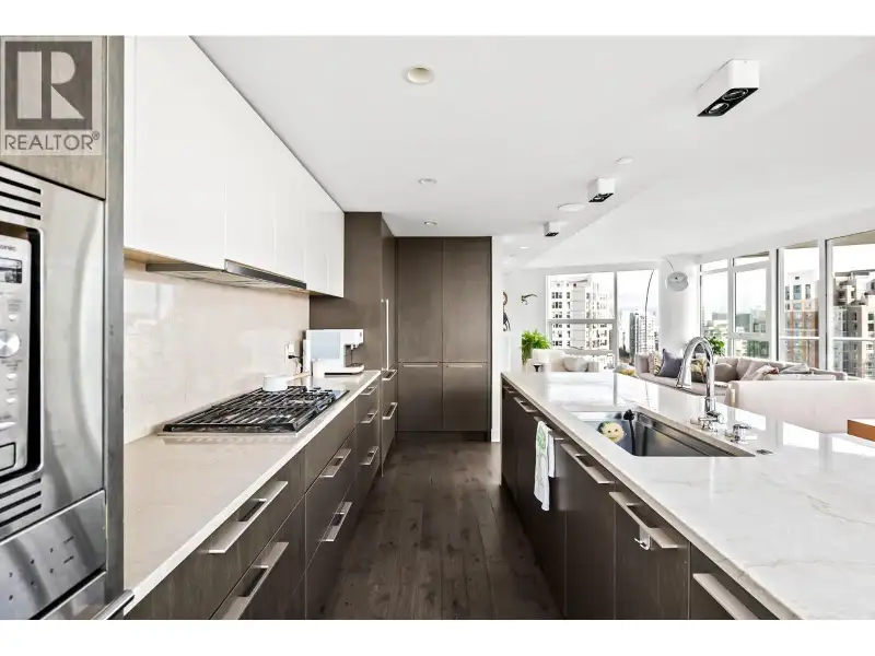 Unparalleled luxury on the 25th floor at The Charleson. This designer suite spans over 1643 square feet with a view that will take your breath away. Featuring engineered hardwood throughout the home & numerous upgrades including tasteful designer lighting, wallpaper, herringbone wood floors, walk in closet & marble fireplace. An open plan chef's kitchen overlooks the expansive living & dining room, with sweeping views overlooking David Lam Park, False Creek, City Hall & beyond. The Primary suite offers plenty of space for your king-sized bed & ensuite which has a bathtub, separate shower & double vanity. The second & third bedrooms are both generous in size. This home comes complete with two additional bathrooms, a private 2 car garage & large storage locker. Building amenities include outdoor pool, hot tub, gym, party room, guest suite & 24 hour concierge. Call for your private showing today ! (id:58403)