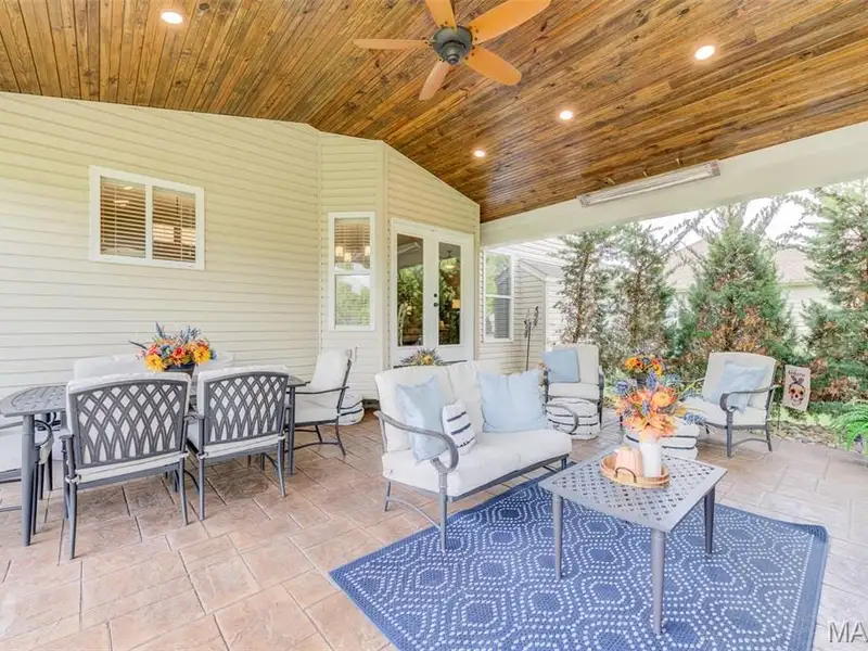 - Large covered patio with stone fireplace