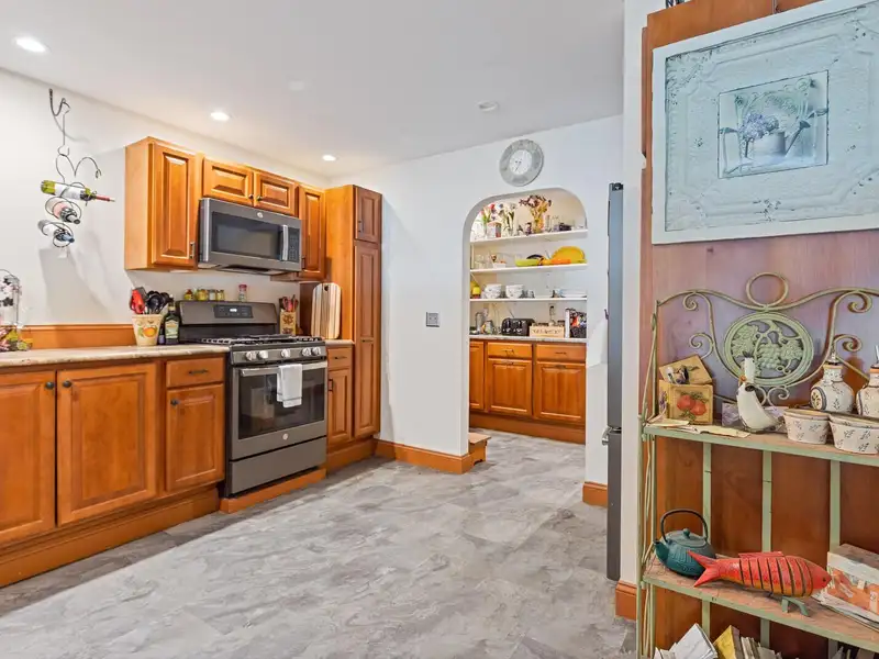 - Kitchen with granite countertops and pantry
