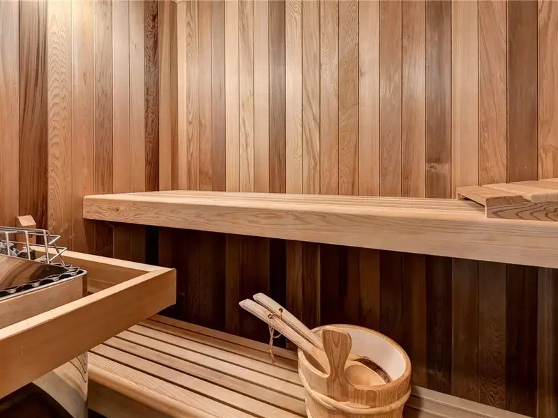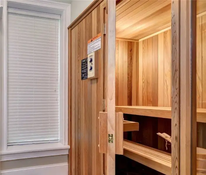 - First-floor primary suite with sauna