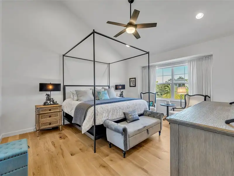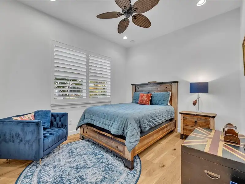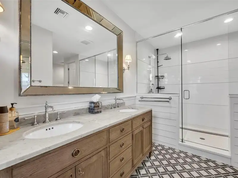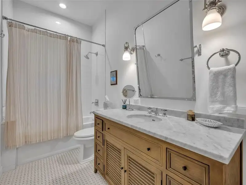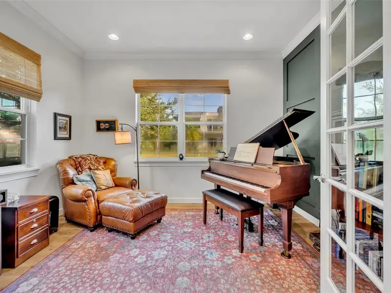 Upstairs, the luxurious primary suite features a spa-inspired bathroom with double sinks, custom Restoration Hardware cabinetry, elegant lighting, and a large walk-in shower. A peaceful sitting area and a walk-in closet with custom shelving create a perfect private retreat. Additionally, an upstairs loft offers versatile space ideal for a home office, gym, or additional quiet area.