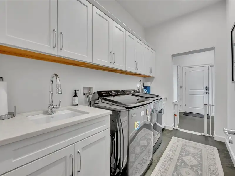 A cozy private den offers an ideal retreat for work or relaxation. On the opposite side of the first floor, you'll find a guest suite with a private bath, two additional bedrooms with custom closets, a stylish full bath, and a laundry room with ample storage and a utility sink. The spacious mudroom, accessible from the two-car garage, provides practical storage with built-in cabinets and hooks.