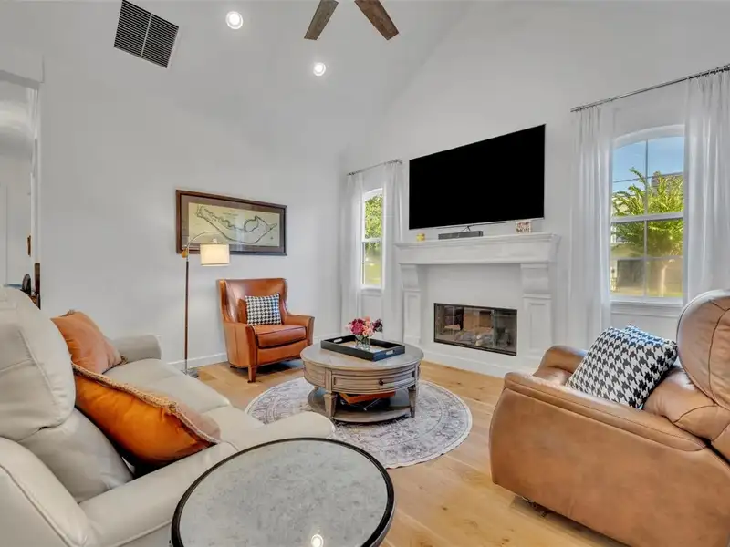 The chef-inspired kitchen is the heart of the home, featuring an abundance of custom solid-wood cabinets, gleaming quartz countertops, and a large island with seating for four. A generous walk-in pantry with custom shelving and top-of-the-line Thermador stainless steel appliances—including a 6-burner gas stove, double oven, and deep farm sink—make meal preparation and entertaining effortless. Adjacent to the kitchen, a charming dining area is perfect for memorable dinners, while the adjoining family room boasts a soaring cathedral ceiling, a natural gas fireplace with a custom stone mantel, and large windows that flood the space with natural light.