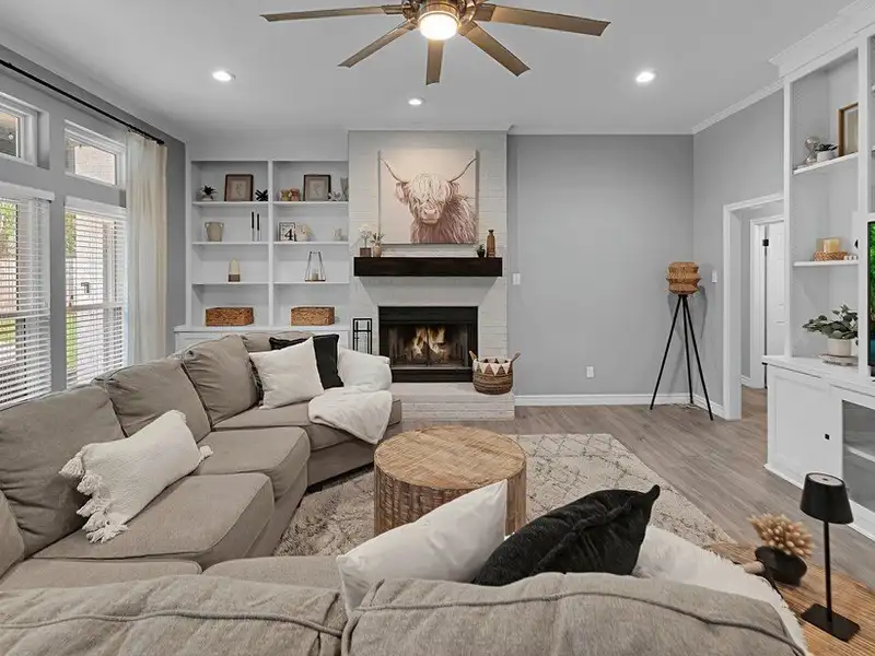 - Built-in wood-burning fireplace in living room