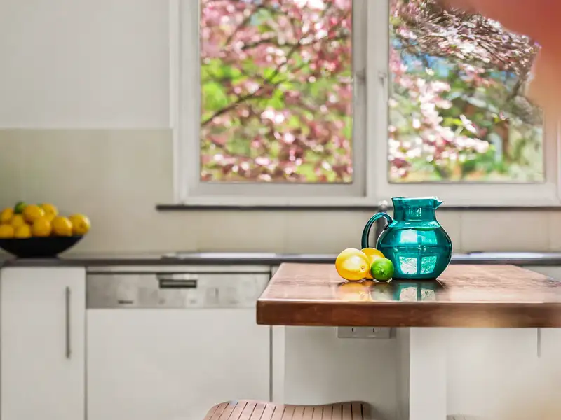The modern kitchen is a delight for home chefs, showcasing sleek stone benchtops, premium Miele appliances, and excellent storage. Bathed in sunlight, it enjoys beautiful outlooks to both the front and rear gardens, making it a true hub for everyday living and entertaining.